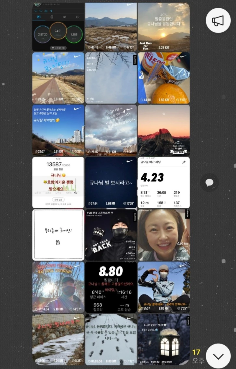 현재 나는 '체인지 러너스'라는 달리기 커뮤니티에서 활동 중이다. 커뮤니티가 생긴 이래 2년 가까이 활동하면서 즐거운 일, 기쁜 일도 많았지만, 얼마 전 정말 가슴 따뜻해지고 감동적인 경험을 했다. 함께 하시는 분들 중 어느 한 분이 최근 회사와 개인적으로 안 좋은 일이 생기셨다는 소식을 전하셨다. 그러자 다른 한 분이 그분을 위해 다함께 '위로 런(Run)'을 하자는 아이디어를 내셨고, 너나 할 것 없이 많은 분들이 동참해주신 것이다. 각자 있는 곳에서 달리기를 한 후 따뜻한 위로의 문구를 넣은 인증 사진의 물결이 시작되었다. 대화방에 사진이 한 장 한 장 올라올 때마다 '세상에는 참 따뜻하고 좋은 사람들이 많구나.' 하는 생각이 들었다. 인증 사진만 보고 있어도 가슴이 벅차올랐다. 사실 100여 명이 넘는 곳에서 실제로 얼굴을 대면한 분들은 손에 꼽을 정도이다. 코로나 시국이기도 하고 지역이 떨어져 있어서 만난다는 게 쉽지 않기 때문이다. 그럼에도 불구하고 우리는 함께 달리고, 함께 나누었다.
