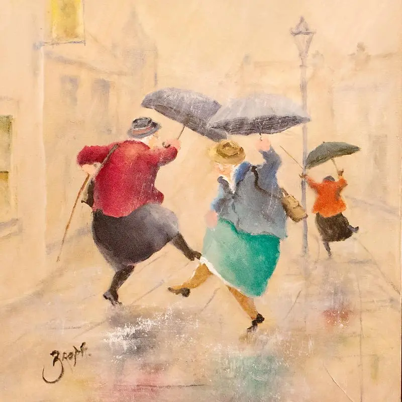 똑똑한 AI의 자동 노출 기능에 의해서일까, 그의 그림들이 가끔 내 SNS 창을 톡톡 두드리곤 한다. 10여 년 전에 읽은 추리 소설이 떠오른 것도 오랜만에 그의 그림 'Dancing in the rain'이 나를 찾아와서다. 이 그림은 <벚꽃 피는 계절에 그대를 그리워하네>의 마지막 장을 덮을 때처럼 나를 전율하게 했다. 몸이 늙으면 마음도 낡아갈 거야. '사랑, 꿈, 열정' 같은 단어들을 욕망하면 추해보일 거야. 몸이 힘든데 크게 즐거운 일이 뭐 있겠어? 늙어보지도 못한 주제에 겁만 많은, 나의 고루한 편견을 박살 내주는 그림이었다. 실체 없는 귀신들이 아침 햇살을 받아 저 멀리 도망가듯 마음도 덩달아 환해졌다. 'Dancing in the rain'를 보고 나면 알록달록한 우산들을 챙기고 친구들을 불러내어 'Sing in the rain'을 떼창 하며 두 발을 오른쪽 왼쪽으로 부딪히는 우스꽝스러운 춤을 추고 싶어 진다. 인생 스케치북에 그려 넣고 싶어 자꾸 눈길이 가는 나만의 명작이다.
