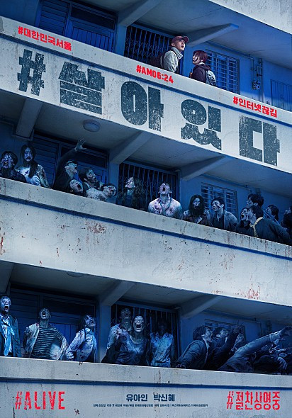 아파트 밖에선 좀비 떼가 멀쩡한 사람을 공격해서 좀비로 만들어버리고, 이들은 이내 준호가 있는 집의 문을 따고 쳐들어오려고 하기도 한다. 이 과정에서 문이 일부 열리는데 이것이 어떻게 가능한 일인지 영화는 제대로 설명하지 않는다. 아무튼 그렇게 하루 이틀 사흘 나흘 시간이 흘러가고 준호는 자신의 상황을 영상으로 담아 #살아있다는 해시태그를 달아 SNS에 올려 구조 요청을 보낸다. 그렇게 고립된 상태로 시간이 흐르고 먹을 것도 떨어지면서 절망이 깊어갈 때쯤 오준호는 삶을 포기할 생각까지도 한다. 그 순간 오준호의 아파트 맞은편에 생존해 있는 김유빈(박신혜 분)이라는 17세 소녀를 만나게 된다. 그녀는 집에 온갖 등산 장비를 갖추고 비상식량도 보유하고 있었기에 생존할 수 있었던 것이다. 박신혜 배우는 영화 시작 38분 후 첫 등장한다.