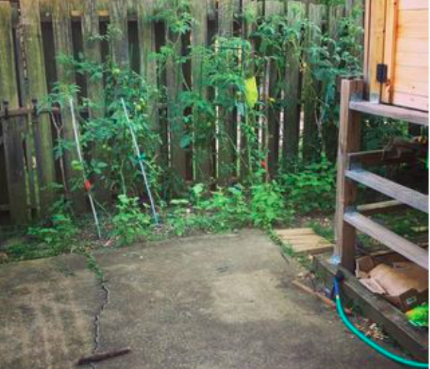 원래 뒷마당은 아래 사진처럼 펜스 앞에 작은 텃밭을 경작(?)하고 있었다. 오른쪽에 얼핏 보이는 목조물은 남편이 '조그만 몸에 딱 맞는 자신들만을 위한 집'을 원했던 아이들을 위해 만들었던 '트리 하우스'였다.