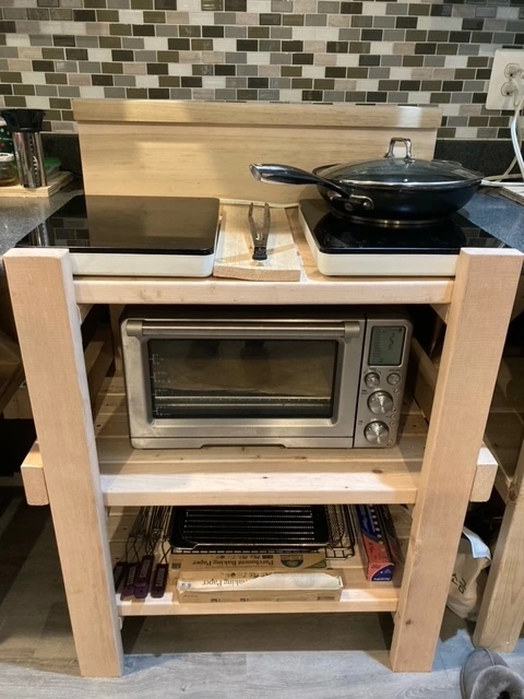 미니 오븐은 이미 집에 갖춰놓고 자주 사용하고 있었고, 값싸고 이동이 쉬운, 주방용 핫플레이트 두 개만 장만했다. 내 기억으로 둘 다 해서 백 불 (한화 십만 원 정도)도 들지 않았던 것 같다. 그것을 예쁘게 배치할 수 있게 구조물을 만들어 달라고 남편에게 요구했다. 나와 남편이 함께 디자인을 하였고, 남편이 지어, 사진에 보이는 구조물이 탄생하였다. 현재 매우 만족하며 사용하고 있다.