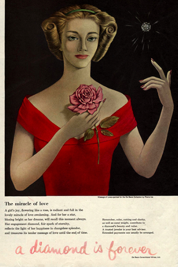 1948년 미국 De Beers 광고 업체의 다이아몬드 영업 캠페인은 대성공을 거두었다. 그들의 광고 슬로건은 결혼을 앞둔 젊은 남녀들의 마음을 움직였고, 이렇게 결혼 로맨스와 다이아몬드와 우리 사랑 영원하기를 바라는 심리적 필요가 혼연일체로 엮이는 역사적 사건이 일어난다. 이후 70여 년이란 시간 동안, 다이아몬드는 점점 더 보편적인 결혼 문화의 일부가 되어, 돈을 모으기 위해 결혼을 미뤘으면 미뤘지 다이아몬드 없이 하는 결혼은 찾아보기 힘들 지경이 되었다. 남자들 사이에선 다이아몬드 반지 정도는 살 수 있는 경제적 능력을 갖추어야 결혼할 수 있다는 경제적 지표로 작용하고 있고, 여자들 사이에선 다이아몬드 알 굵기가 얼마나 괜찮은 결혼을 했는지, 얼마나 사랑을 받는지를 보여주는 결혼 보증서처럼 인식되고 있는 현실이다.