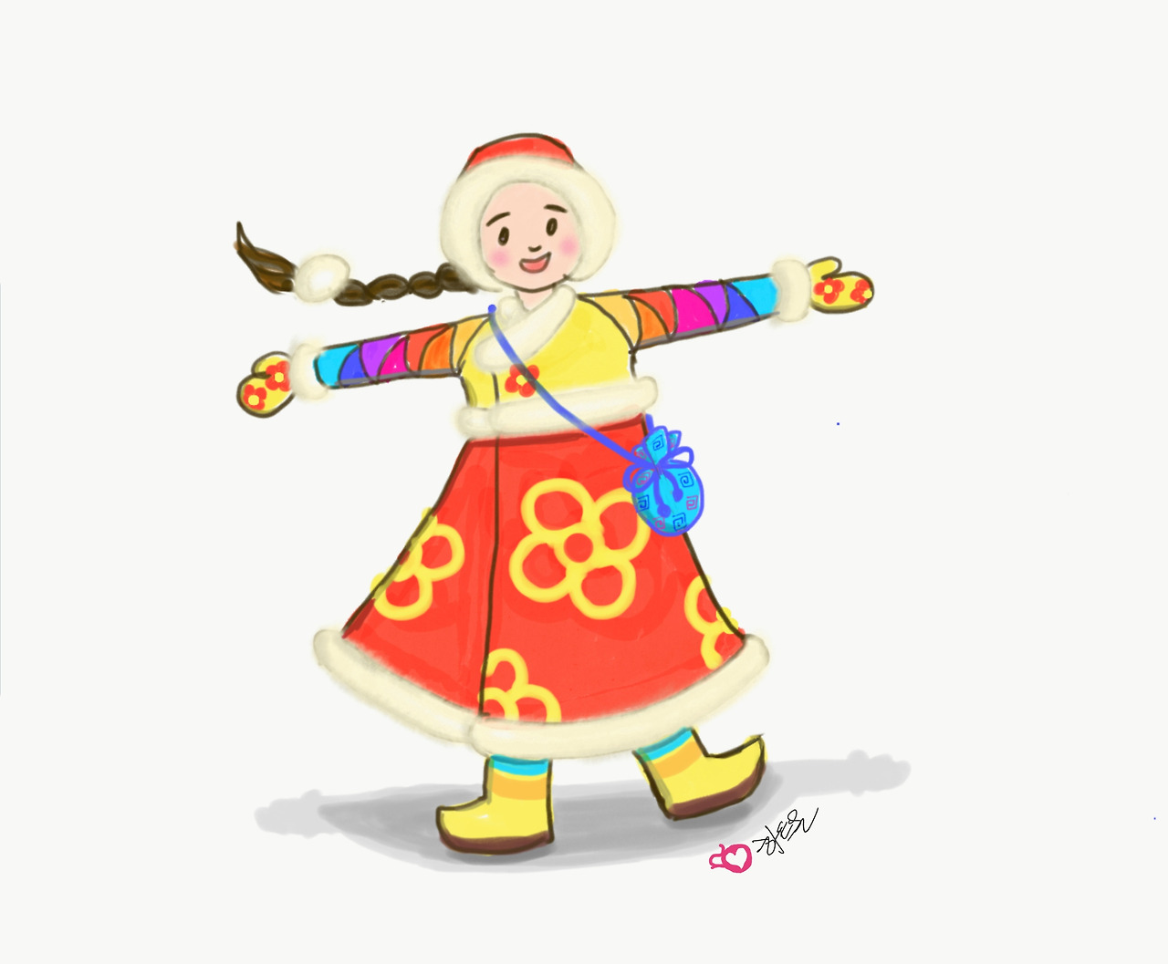 오늘 어릴 때 생각이 나서 한복 그리기에 또 도전해 보았습니다. 원래는, 설날을 맞아 전통 한복 입은 소녀를 그려 보려 했는데, 제가 애 엄마다 보니, 한복이 따뜻한 털코트로 변해버리고, 고무신이 부츠로, 머리에 털모자까지 씌우게 되네요. 겨울엔 따뜻한 게 장땡이라는 마음으로 한복 느낌 나는 설빔 코트를 그려보았습니다.