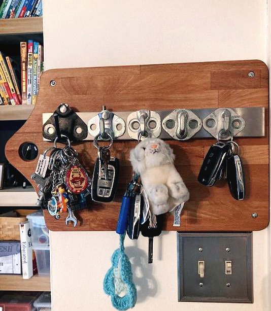 물건이 새로운 용도로 기발하게 재탄생하는 것을 목격하는 것은 말로 다 할 수 없는 기쁨과 감격을 준다. 어떻게 도마를 이렇게 쓸 생각을 했을까. 그대로 버려질 뻔했던 폐차 부품들이 이렇게 아름답게 새활용 되는 것을 보는 기쁨과 감격이란! 완성된 열쇠걸이는 예쁘고, 기특하고, 마음에 쏙 든다. 볼 때마다 마음이 벅차고 설레서 좋고, 문 앞 테이블 위에 열쇠 더미가 마구 쌓여있지 않게 정리해 주는 실용적 쓸모가 훌륭해서 좋다.