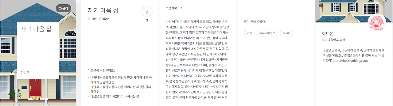 작년 이맘때쯤, 저는 저의 20대에 가장 큰 영향이었던 버지니아 울프 작가의 <자기만의 방>을 다시 읽었습니다. 가을 단풍이 한창인 산책길을 울프 작가와 함께 걸으며 사색하고 그 생각들을 기록한 <자기 마음 집>도 두어 달 전 브런치북으로 묶어 발간을 했었습니다. 울프 작가의 오랜 마니아로서, 저의 어리고 미성숙하던 시절 내면 여정 가이드가 되어주었던 그녀의 저서 <자기만의 방>을 잇는 후속작 느낌으로 쓰고 싶어 시작한 <자기 마음 집>은 쓰면서 참 즐겁고, 동시에 대대적인 집청소 집정리를 하는 것처럼, 마음이 정결히 정돈되는 느낌이 들었던 기억이 납니다. 독자님의 내면에도 그렇게 쾌적하고 정갈한 느낌으로 다가갔으면 좋겠습니다.