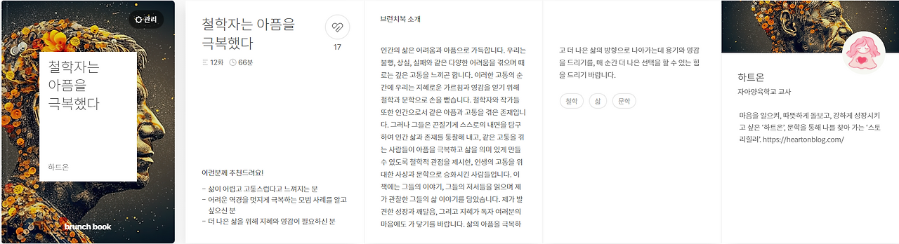 올해는 브런치가 '브런치 스토리'로 다시 태어나고, 여러 분야 '크리에이터'를 지정하고 변화를 시도하려는 움직임이 컸고, 그런 상황에서 열리는 출판 프로젝트는 뭔가 여느 해 보다 그 열기와 진지함이 뜨겁고 진하게 느껴집니다. 그런 기운 덕분에, 개인적으로 2년 전부터 기획하고 썼으나, 좀처럼 한 권의 책으로 묶기 힘들었던, <철학자는 아픔을 극복했다>도 완성해서 브런치북으로 묶는 쾌거를 누릴 수 있었어요. 이 책은 지난 몇 년 간저의 독서와, 그 독서를 통한 철학과 문학 여정과, 여러 사상가 작가들의 삶, 아픔, 깨달음과 발견에 대한 저 나름의 통찰과 이해를 담고 있습니다.