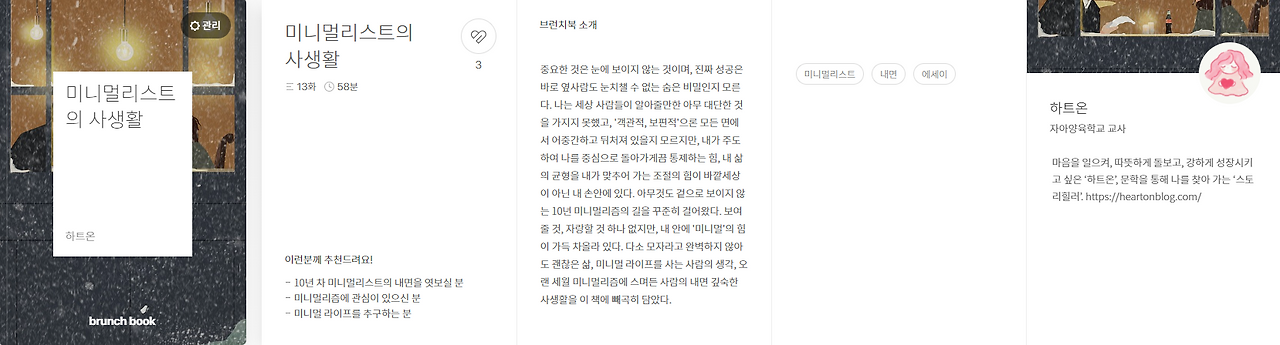 스스로의 정체성 리스트에 '작가', '교사'와 함께 꼭 '미니멀리스트'라는 이름을 넣는 편인 저는, 미니멀리즘을 끊임없이 추구하며, 눈에 보이는 생활에 뿐 아니라, 눈에 보이지 않는 내면 라이프에도 미니멀리즘을 적용하려는 의지를 가지고 매년 미니멀 라이프를 주제로 하는 브런치북을 이어 발행하고 있습니다. 공교롭게도 제가 발행하는 브런치북 중에 미니멀리즘을 주제로 하는 <미니멀리스트의 유용한 도구들>, <미니멀리즘 그 다음엔?>이 가장 인기가 있더군요. 그 외에도 <내 삶을 바꾼 미니멀리즘>도 제가 미니멀리즘을 추구하기 시작하면서 개인적으로 겪은 변화 성장 과정을 담고 있는 재미있는 책이니 많은 분들이 관심을 가져주셨으면 합니다. 이 책들에 이어 2023년 7월에 <미니멀리스트의 사생활>이라는 브런치북을 묶어 발간했는데요, 이 책은 어언 10년 차 미니멀리스트가 된 저의 미니멀리스트로서의 고민과 사색, 10년간의 미니멀리즘 추구가 삶에 끼친 영향 흔적을 담고 있는 책입니다.