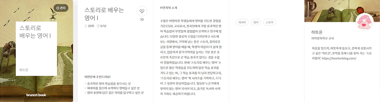 저는 본업으로 영어 지도하는 일을 하고 있어서, 항상 지도하는 학생들이 더 나아가 영어와 매우 다른 언어 문화권에서 훈련된 한국인이 어떻게 영어를 효과적으로 잘 배울 수 있을까 하는 고민이 저의 머리를 떠날 수는 없답니다. 언제나 영어와 함께 하는 영어 생활자로서 영어학습에 대한 아이디어가 떠오를 때마다 기록해 두고, 기록이 모이면 브런치북으로 묶는 작업을 하고 있습니다. 2년 전에 <영어를 알고 나를 아는 영어 훈련>이라는 책을 묶었었고, 올해 <스토리로 배우는 영어 I> 브런치북을 만들었는데, <스토리로 배우는 영어> 라는 시리즈로 계속 브런치북을 이어나갈 예정입니다.
