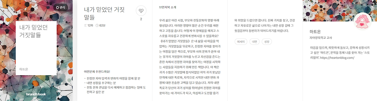 저는 지난 3여 년의 시간 동안 브런치 스토리를 통해 800개가 넘는 글을 발행하였고, 오늘 30번째 브런치북 <내가 믿었던 거짓말들>을 발간했습니다. 부모와 사회가 내 머릿속에 밀어 넣은 가치와 생각들이 이끌고 갔던 저의 못났던 내면에 대한 폭로와, 이후 변화 성장하는 과정을 모두 담고 있는 제 삶의 역사책이라는 의미가 있어서, 개인적으로 특별히 아끼는 책이 될 것 같아요. 그런 만큼 독자님들께서 이 책을 같은 마음으로 아끼고 좋아해 주셨으면 하는 바람입니다.