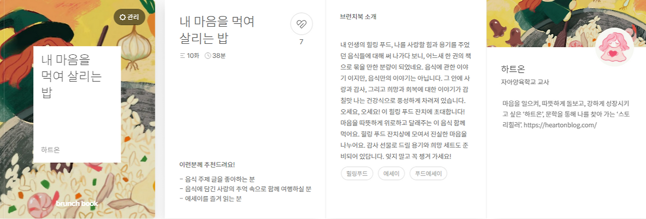 올해는 '힐링 푸드 에세이'라는 새로운 장르를 한 번 시도해 보고 싶어서, 개인적으로 특별하게 여기는 음식과 그 사연을 담은 <내 마음을 먹여 살리는 밥> 이라는 브런치북도 묶었던 경험이 참 좋았는데요, 그림 동화 작가 하지 님께서 책 표지 그림도 그려주셔서 더욱 의미 있는 브런치북이 되었습니다.