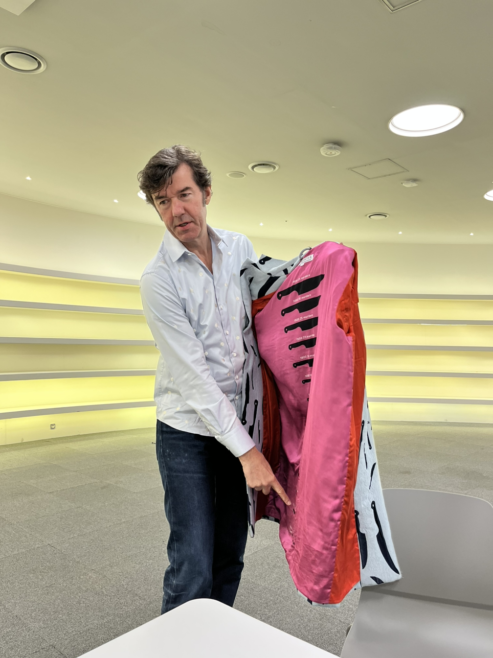 그가 이번에 입고 온 옷에는 크고 작은 칼들이 잔뜩 그려져 있는데, 옷 속에는 범죄로 죽은 사람들의 수의 변화가 칼의 크기로 어떻게 바뀌어왔는지 보여주고 있더군. 이런 옷을 입고 공항을 들락거리다 겪은 에피소드도 있더라고. 여러모로 재미있고, 매력적인 작가야. ddp에서 하는 전시 한번 가서 봐봐. 내년 3월 3일까지라 시간이 넉넉하지만, 사람들이 핫한 이슈로 대화를 주고받을 때, 침묵의 도가니에 빠지면 안 될 테니, 빨리 가서 보는 게 좋을 거야. 장담해. 돈이 절대 아깝지 않을 거야. 무료니까.