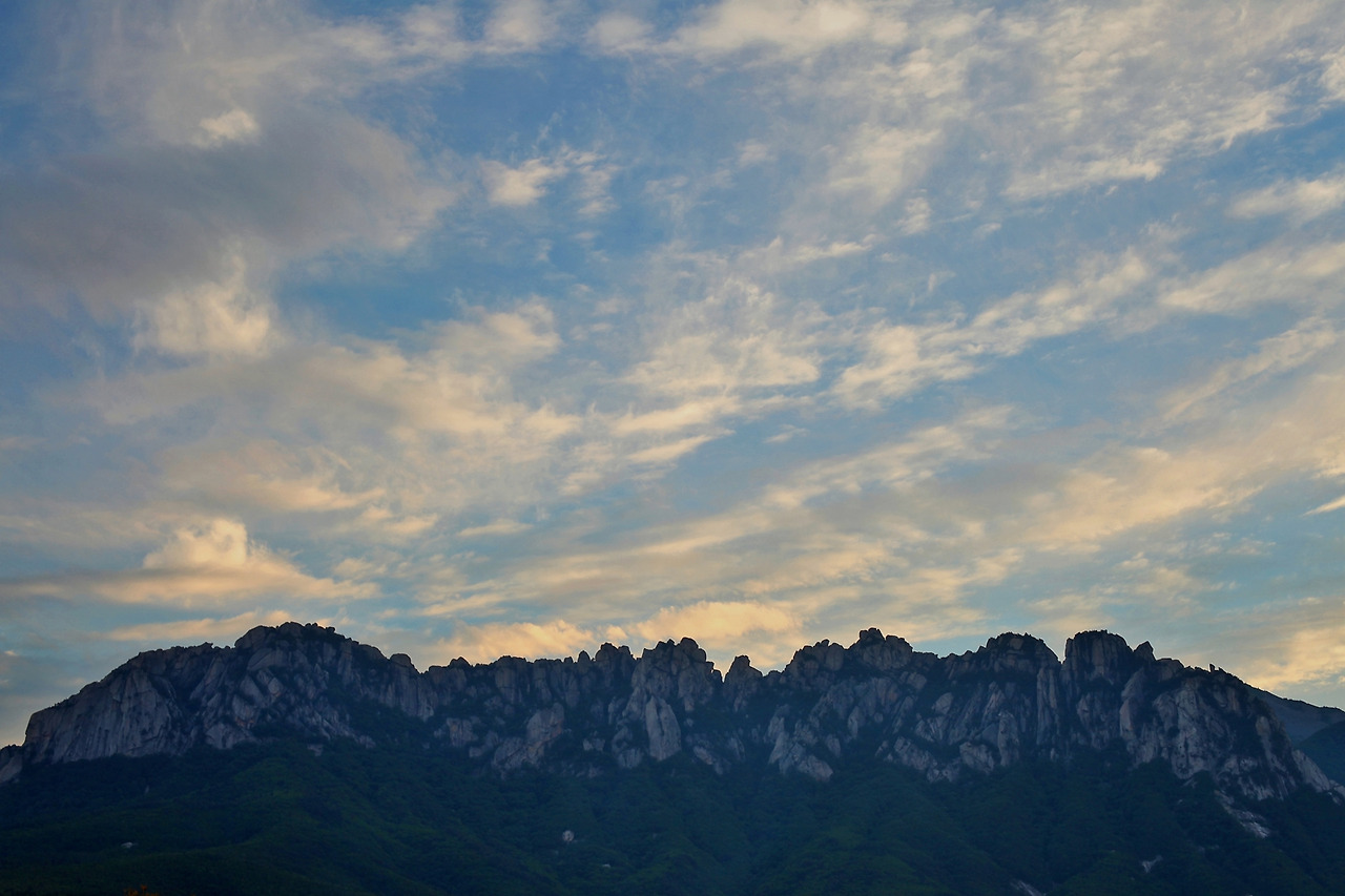 44번 국도에서 갈라져 속초로 가는 길. 설악의 울산바위는 우주에서 떨어진 거대한 생물의 등껍질 같이 솟아 있다. 서늘한 바위들은 기립해 방문자를 환영한다. 저녁놀이라도 보이면 최종 목적지로서의 바다는 머릿속에서 지워진다.