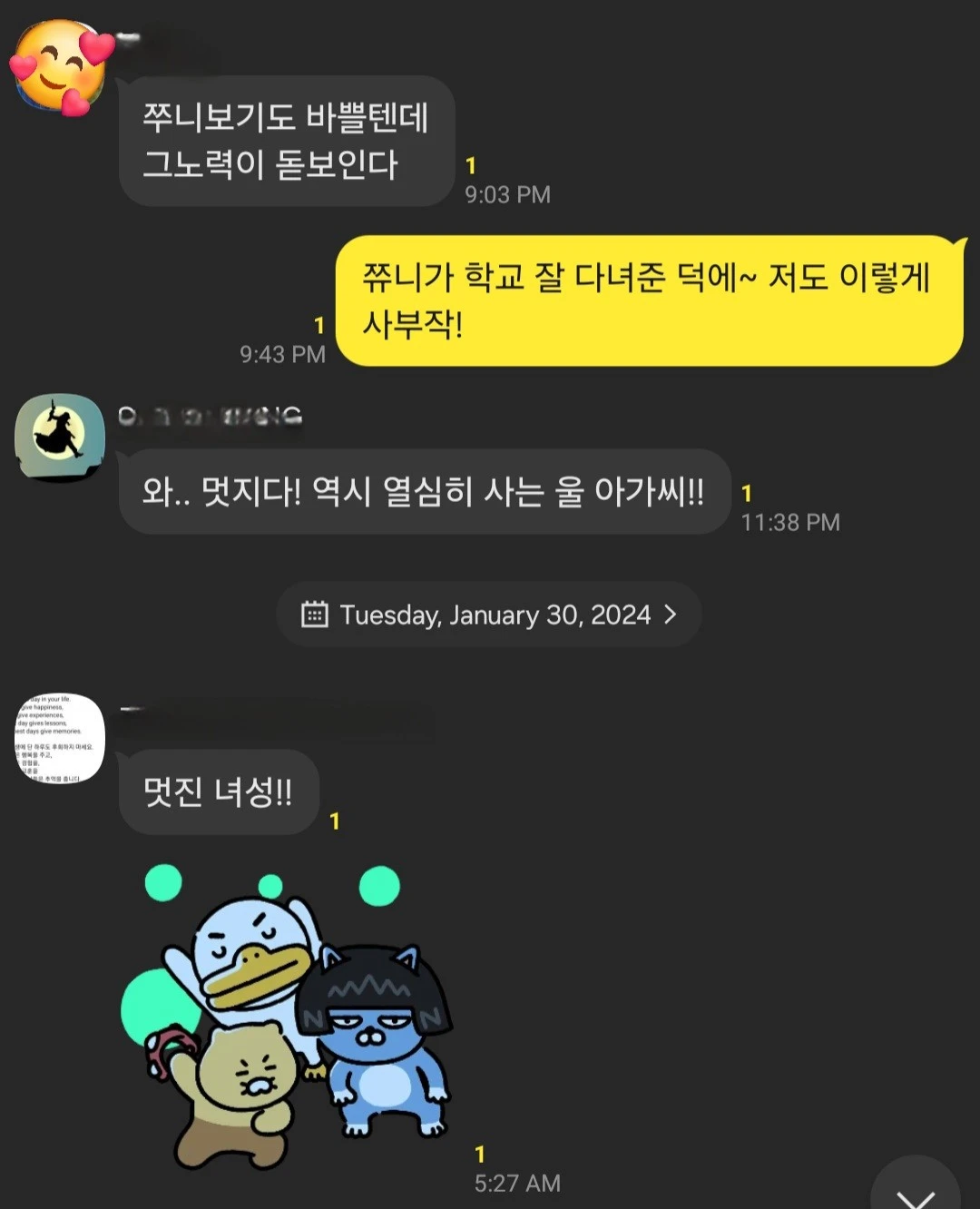 진심으로 나의 여정을 축하해 준 가족들의 카톡 메시지. 어쩜 난 가족들의 응원과 인정의 말이 가장 고팠던 게 아니었을까.