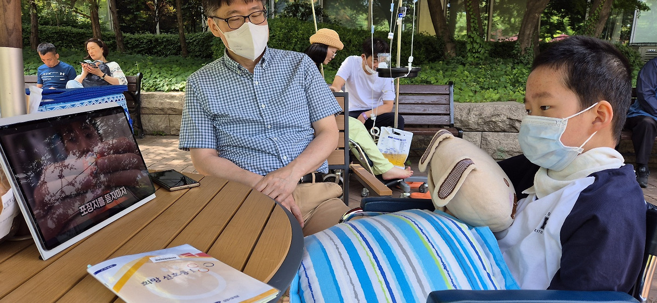 현재 우리는 7층 2인실에 자리를 차지한 채 다시 주치의 선생님의 퇴원 신호를 간절히 기다리고 있다. 물론 퇴원이 능사가 아니라 치료가 우선이라는 본질을 모르지 않는다. 그러나 정음의 상태가 간절하게 집을 향해 있다. 식음을 전폐한 채 울다가 잠들다 다시 울다가 겨우 눈을 떠 내내 짜증과 눈물을 보인다... 아이를 달래는 데 지치다가 겨우 겨우 달래서 밥을 조금 먹인다. (겨우 겨우 먹였다.....) 그리고 아이가 세상에서 가장 사랑하고 좋아하는 외할머니를 만나 지금 겨우 심적 안정을 취하는 중이다. 할머니가 급히 가져다주신 최신형 갤럭시 탭 S9과 기타 필요한 물품을 잽싸게 준비해 주신 구원자 같은 외할머니....