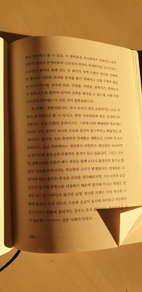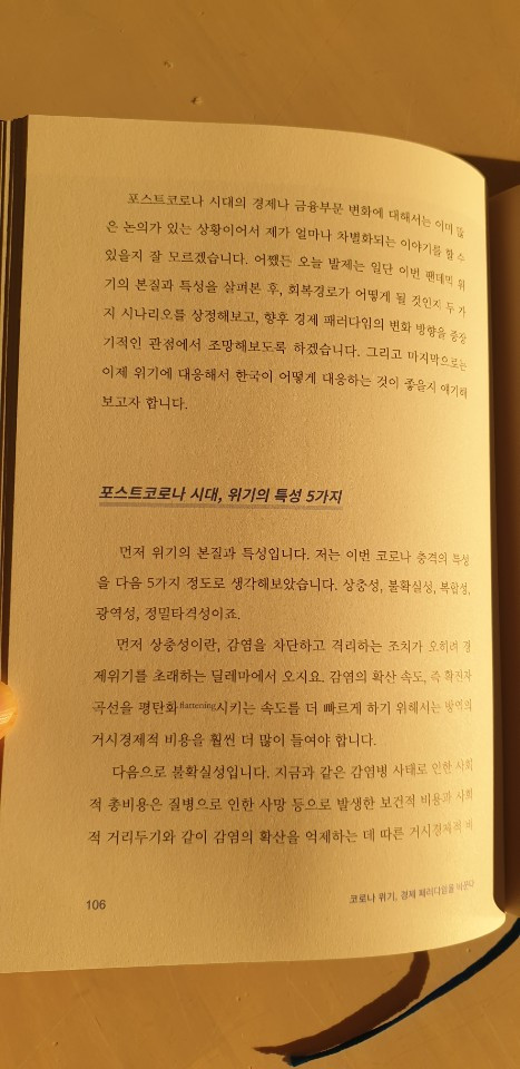 주요 골자는 코로나 팬데믹 시대에 언텍트 (영어로 적합한 표현은 컨텍트 프리) 빅테크, 큰 정부의 출현 (국가의 개입 범위가 커짐) 기업의 사회적 책임 및 존속에 대한 이유의 재정립, 경영과 조직경영의 관점의 변화, 무엇보다 경제.....나는 특히 함준호 교수님의 경제 부분을 아주 심각하게, 그리고 밀도 있는 그의 설명에 모두 다 필사를 해 버리고 말았다. (상충성, 불확실성, 복합성, 광역성, 정밀타격성, 코로나 충격의 5가지 특성, 그로 인한 경제적 영향) 현재는 그야말로 '버블' 위기라 느껴지는 것, 그런 막연한 내 생각이 그렇게 틀린 논리는 또 아니라는 것에 대한 누군가의 증명된 목소리를 다시금 듣는 것 같았기에....