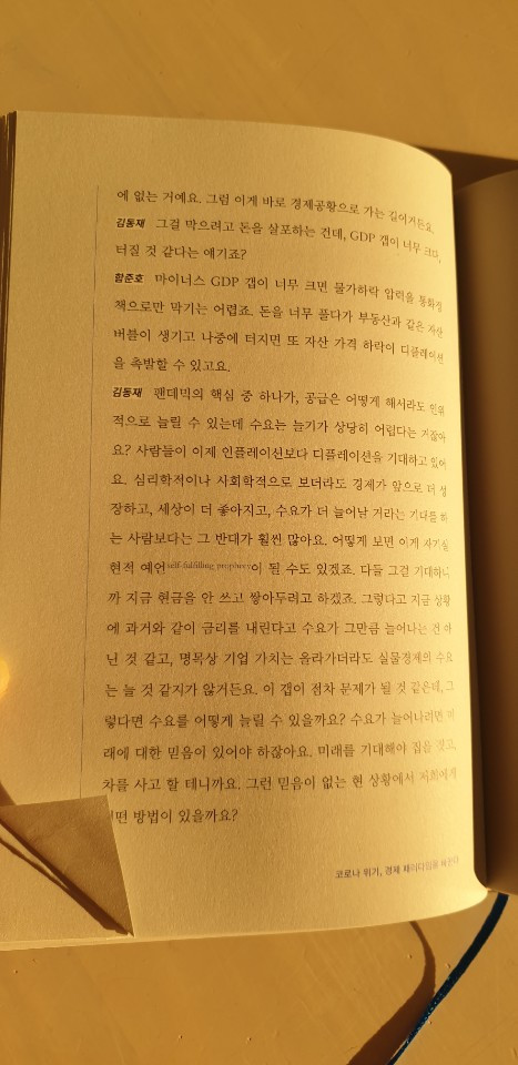 사람들이 이제 인플레이션보다 디플레이션을 기대하고 있어요. 심리학적이나 사회학적으로 보더라도 경제가 앞으로 더 성장하고 세상이 더 좋아지고 수요가 더 늘어날 거라는 기대를 하는 사람보다는 그 반대가 훨씬 많아요. 어떻게 보면 이게 자기실현적 예언이 될 수도 있겠죠. 다들 그걸 기대하니까 지금 현금을 안 쓰고 쌓아두려고 하겠죠. (김동재)