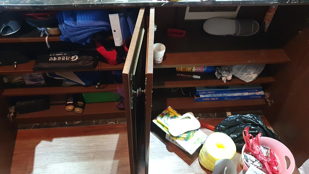 ㆍ서랍장은 청소용품 칸(걸레), 운동기구 칸(줄넘기, 탁구채, 배드민턴공, 배드민터채 등), 위생용품 칸(마스크, 소독제) 구분하기