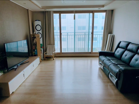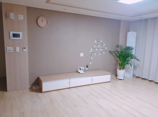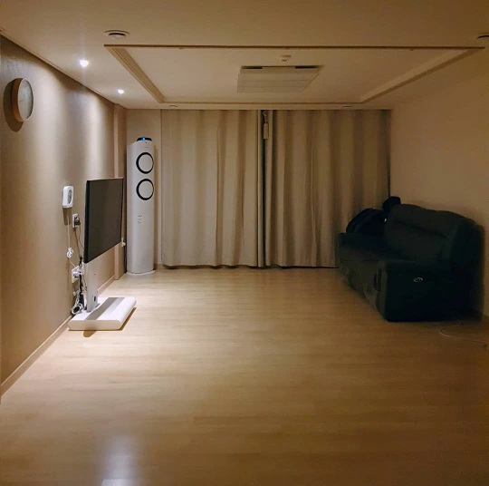 현재 거실에는 텔레비전과 소파, 에어컨이 있다.