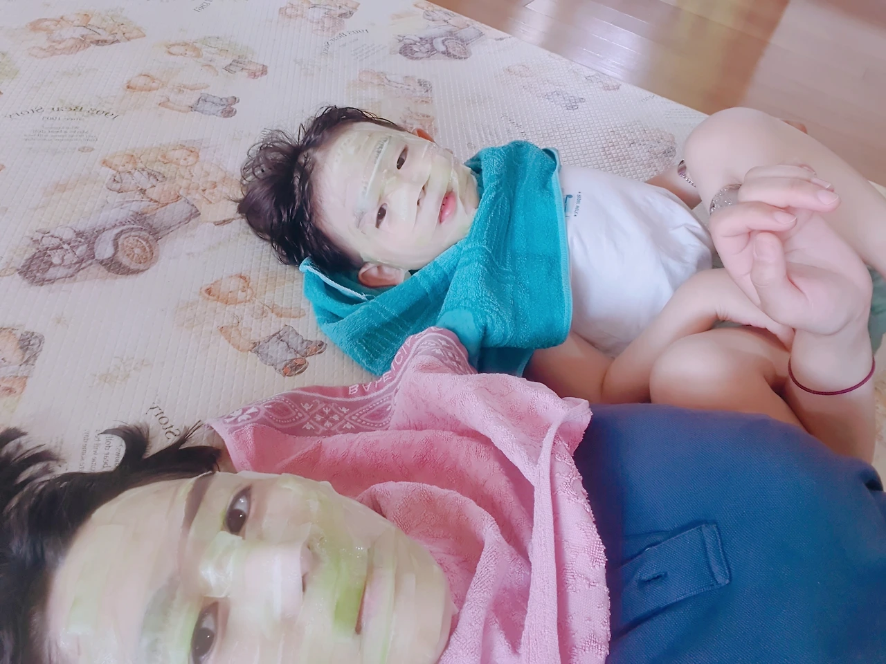 4살 아이는 오이팩 미라로 변신하고, 입술 위에 올려진 오이를 혀로 힐끔힐끔 맛보며 재밌다고 깔깔거렸다. 그러다 몰래 얼굴에 붙어있는 오이를 살짝 잘라먹기도 했다. 우리는 거실에 대짜로 누워서 큰 거울을 보며 서로 괴물이라고 놀리기도 했다가 눈을 감고 쉬기도 했다가 할머니랑 재잘재잘 얘기도 나누었다.
