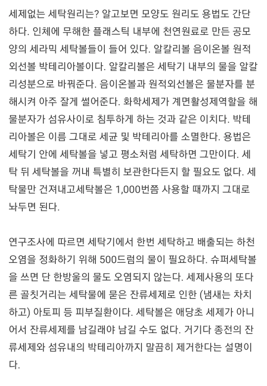 사실 세제를 사용하면서도 세제안의 화학물질이 피부에 안 좋다는 것을 익히 들었길래 소량씩만 넣고 빨래를 했었는데, 세탁볼은 이런 면에서 안심이 되었다. 매일 빨래를 해도 세탁볼을 3년을 사용할 수 있어서 세제 비용도 아껴 경제적이다. 가루나 물세제 없이 물과 세탁볼로만 세탁하기 때문에 간편하고 환경에도 이롭다.