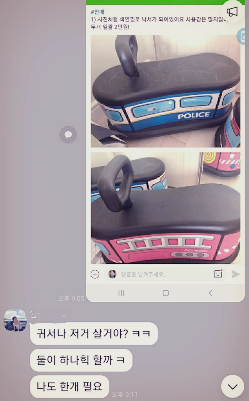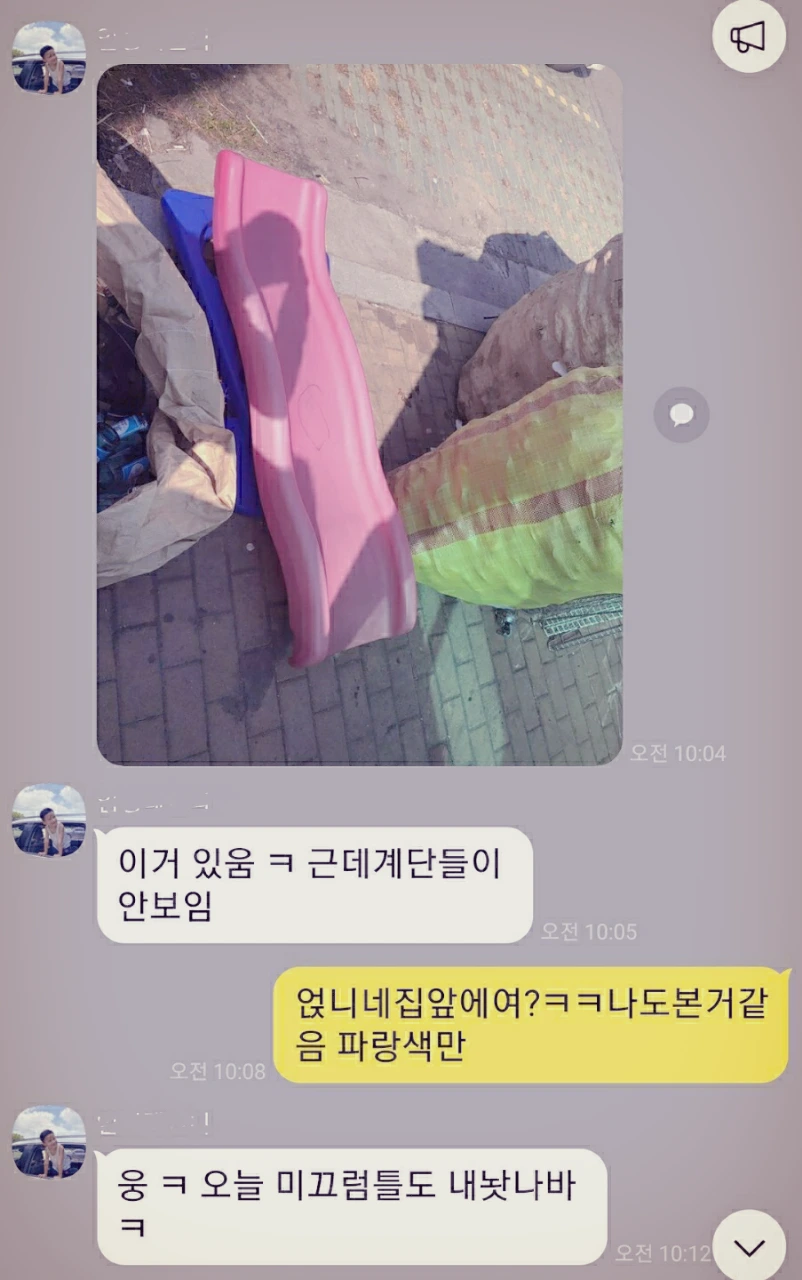 육아도 살림도 함께하고, 시간이 맞는 날은 중고거래도 함께 한다. 서로 필요한 육아용품이나 살림 템들을 중고로 구해주기도 한다. (중고거래는 선착순이기 때문에 먼저 줄 서는 게 중요하다.)그리고 아주 가끔은 쓰레기장에서 득템 하기도 한다.