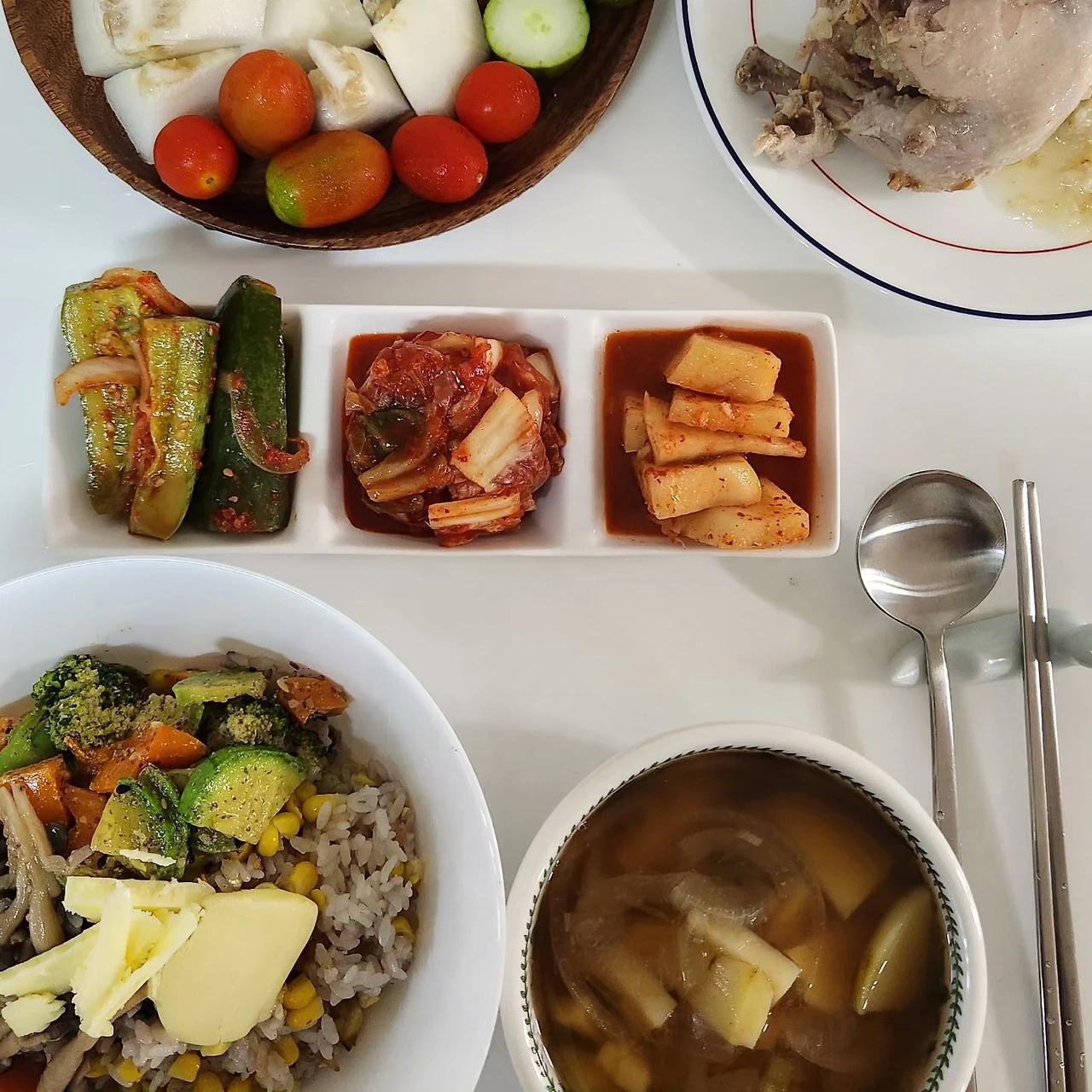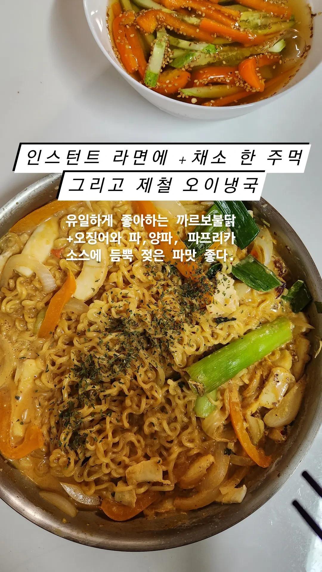 아이의(남편 포함) 건강한 식습관을 위해서 인스턴트는 최대한 피합니다.(예외도 많습니다.) 아이가 원하면 인스턴트에 대해 충분히 설명해 준 다음 양을 조절해 줍니다.그리고 팁으로 인스턴트를 먹을 때 제철식재료를 더합니다. 예를 들어 남편의 불닭볶음면 안에는 양파와 마늘을 듬뿍 넣고 제철 미나리를 고명으로 올린다던지, 아이가 좋아하는 짜파게티 안에는 양파를 볶고 제철 감자나 당근을 깍둑 썰어 넣기도 합니다. 그날그날 다르지만 특히 양파와 마늘은 어떤 음식에도 무리 없이 조화롭게 어울립니다. 샐러드나 과일은 식전에 미리 챙겨 먹습니다.