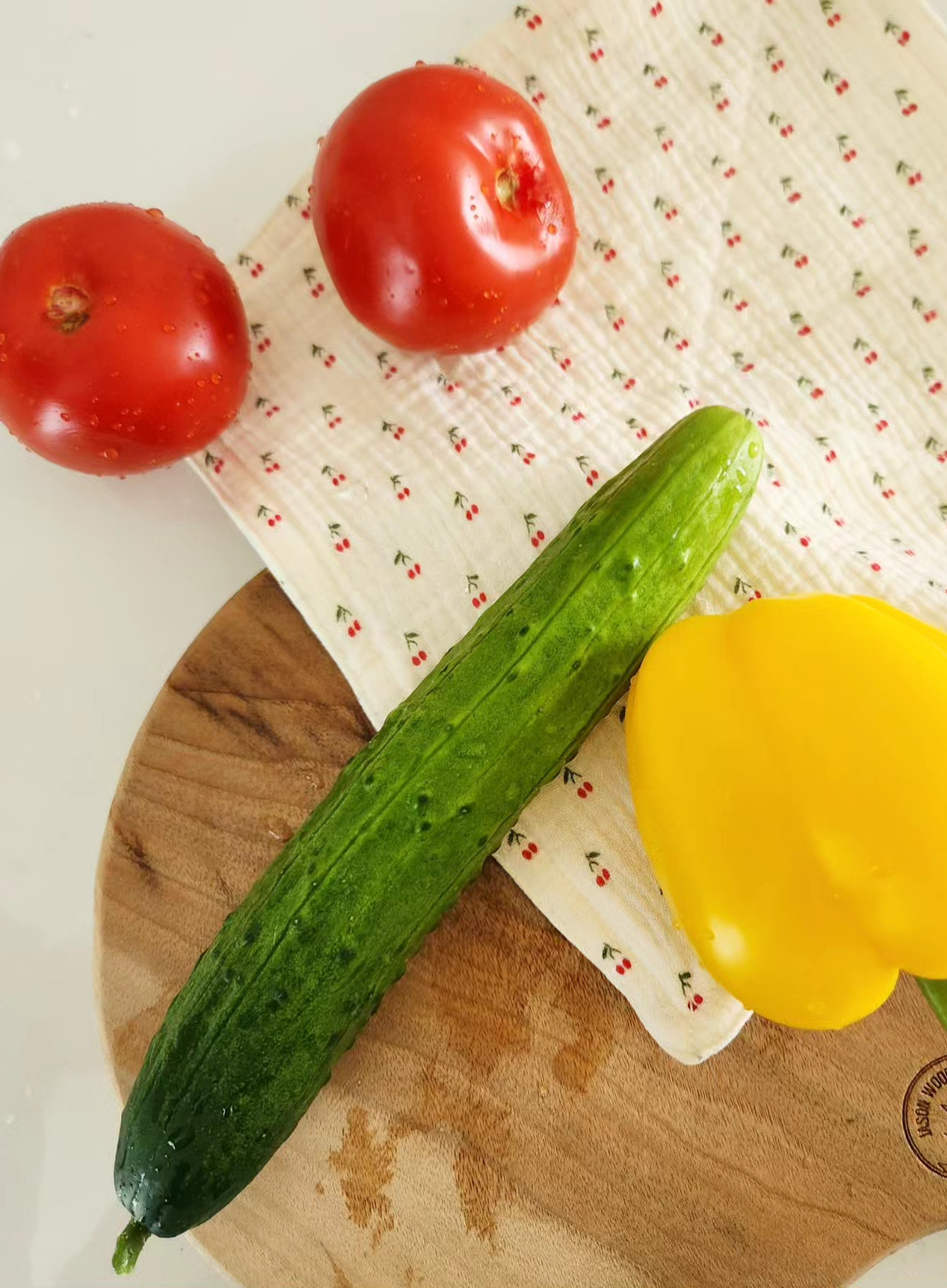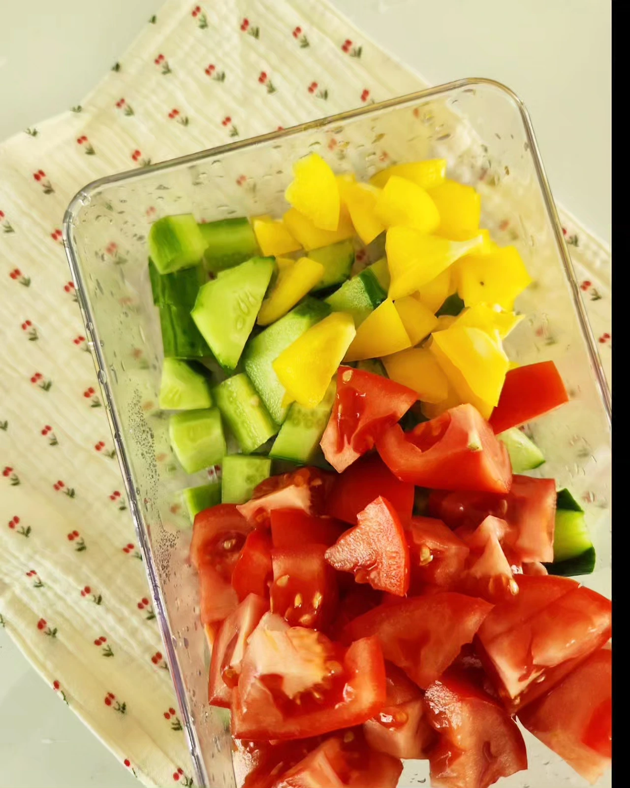 1. 여름 채소들을(오이, 파프리카, 토마토, 참외 등) 깨끗하게 씻은 후 먹기 좋은 크기로 깍둑썰기를 합니다.