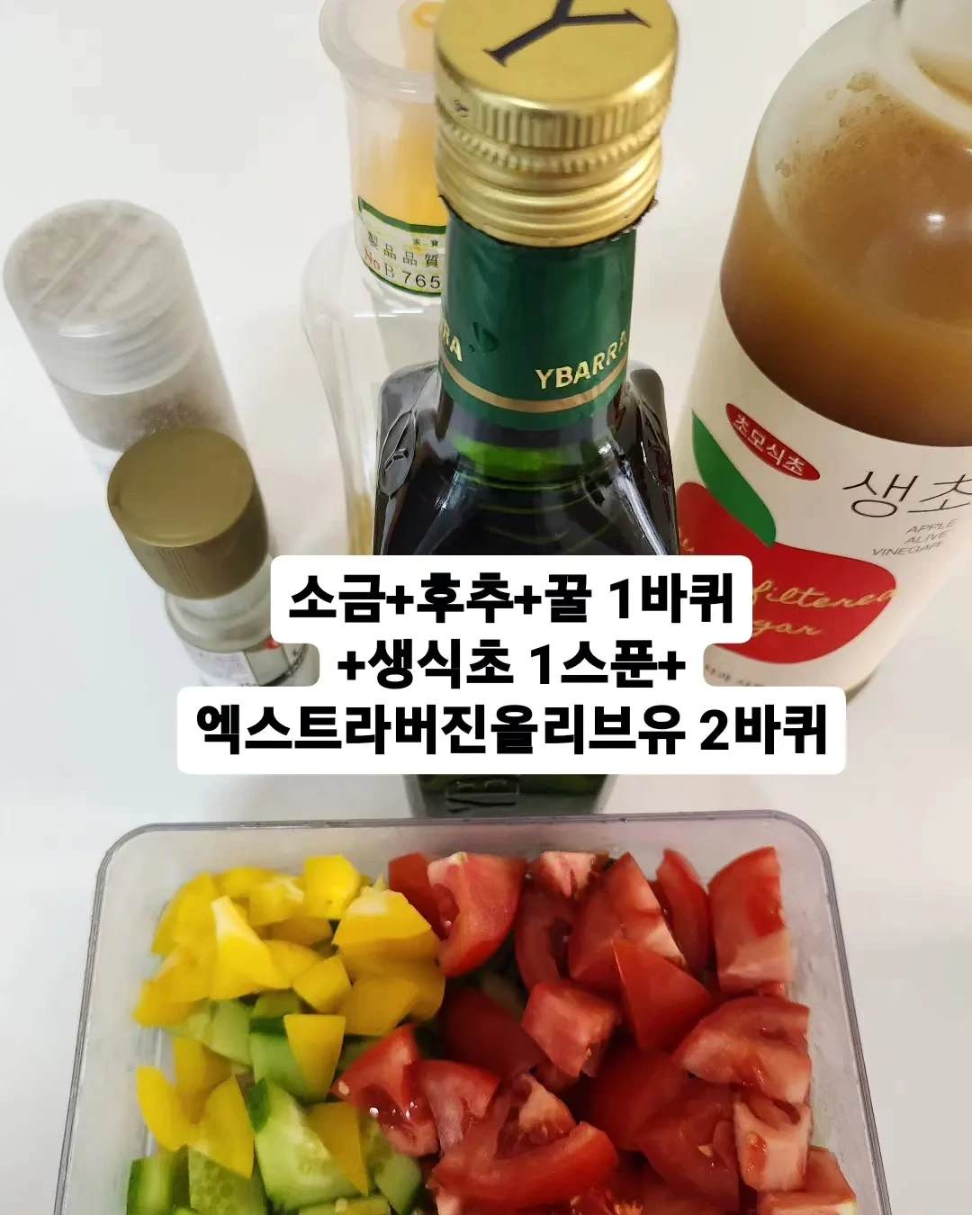2. 뚜껑이 있는 통에 넣고, 먼저 올리브오일을 2바퀴 두르고, 식초 2스푼, 매실 진액 2스푼, 후추와 소금을 감칠맛이 날 정도로 조금 뿌려줍니다.