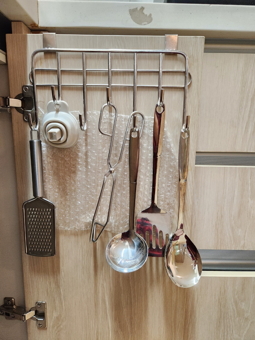 아이가 가끔 주방에서 손을 씻는데 욕실까지 가서 닦는 것이 귀찮은지 자주 생략합니다. 작은 손수건을 싱크대 아래 걸어두니 말하지 않아도 잊지 않고 물기를 닦습니다.