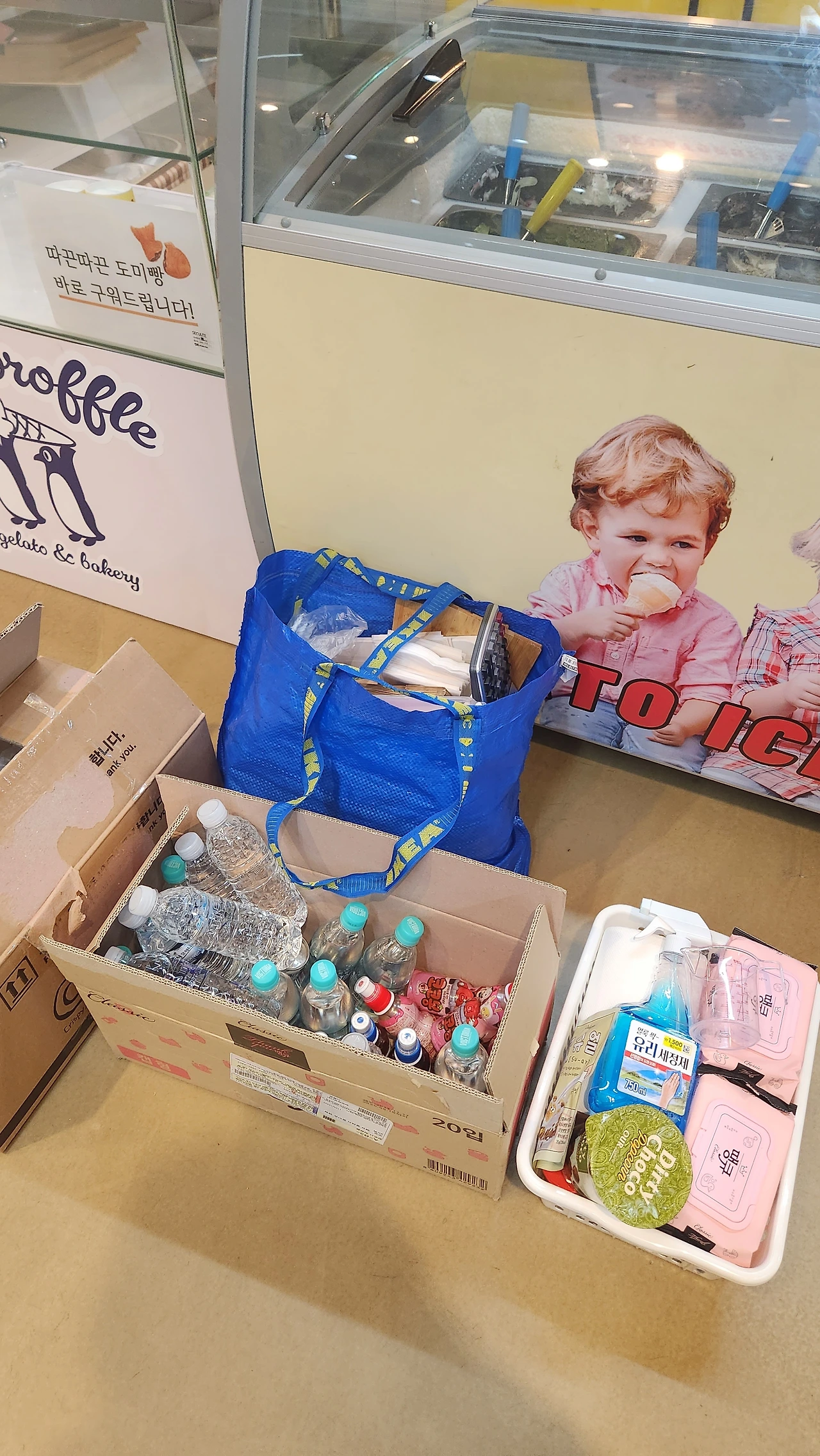 네 번째, 3평 남짓 작은 공간이지만 어떻게 하면 젤라또 팝업매장이 깔끔하고 단정해 보일지 생각해야한다. 쇼케이스는 아이들 손님이 다녀가면 침자국, 손자국, 아이스크림이 묻어 있다. 틈틈이 닦아줘야 하고 오후 3시쯤 되면 햇빛이 젤라또 매장에 정통으로 비추기 때문에 먼지가 많이 쌓여있는 것이 눈에 띄게 보인다. 시간 날 때마다 닦고 털어내야 한다. 택배가 온 날이면 물건들의 배치와 정리정돈은 필수다. 모든 택배는 4층 매장으로 바로 오지 않고 2층 야외 하역장에 도착하기 때문에 빠르게 가져와야 한다. 이또한 너무 귀찮은 일이지만 하루에 세 번씩 가는 일도 생긴다. 그리고 어떻게 하면 효율적인 정리정돈을 할 수 있을까? 고작 2평 매장 안이지만 그 안에서 조금 더 넓게 사용하려면 어떤 배치를 해야 할까? 매일 고민하고 옮기고 닦고 정리 정돈한다.