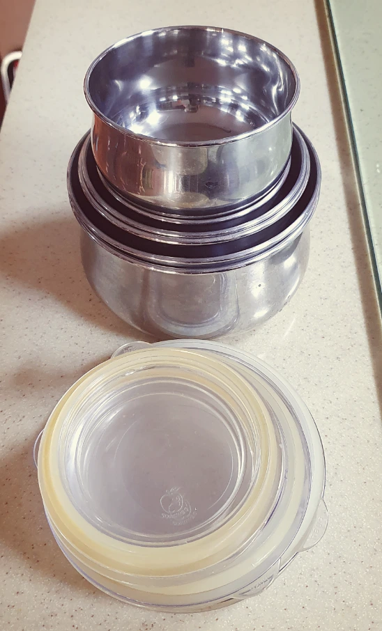 그릇은 많았지만 반찬통이 부족한 우리 집이었다. 마침 요즘 반찬을 만들면 보관할 곳이 부족해 반찬통을 몇 개 더 사야 하나 고민하던 차였다. 최대한 한 번 사면 오래 사용할 수 있고, 위생적인 반찬통을 알아보고 있었는데, 오늘 할머니 집에서 득템 했다. 스테인레스라서 위생적이고 관리도 쉬우며 디자인까지 내 마음에 쏙 들었다.