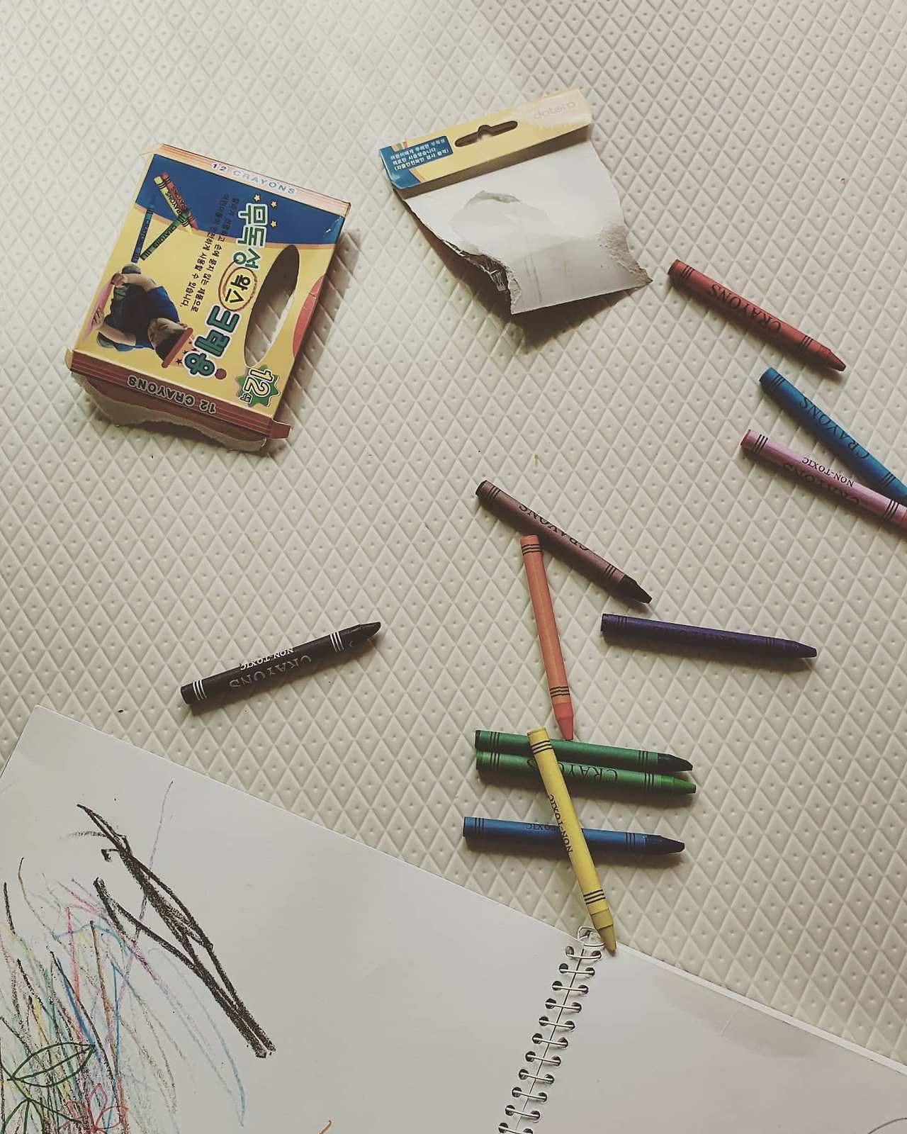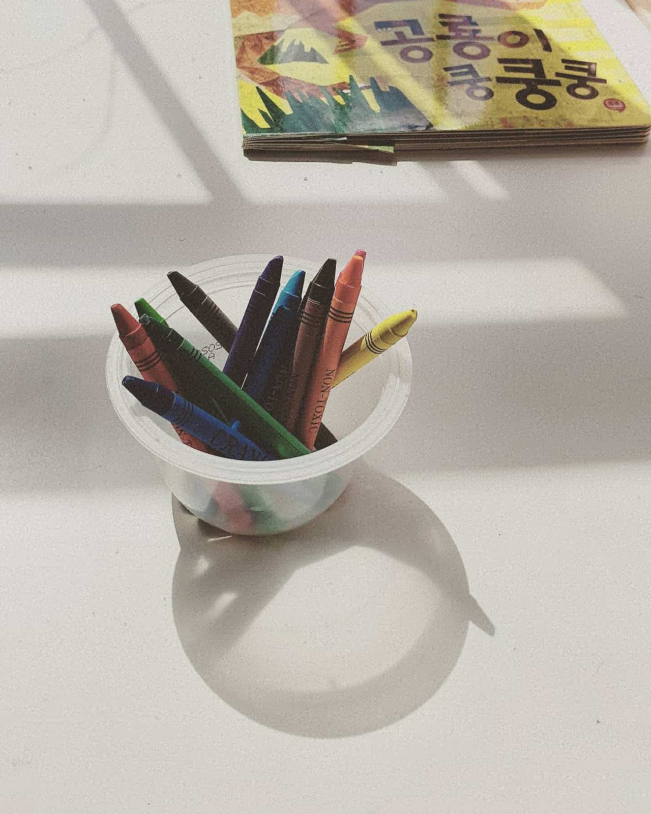 최근에는 아이가 이웃 누나에게 선물 받은 색연필이 있었는데, 혼자서 색연필을 열어보겠다고 뜯다가 색연필 보관 박스를 그만 찢고 말았다. 젤리컵이 미니 색연필 보관에 딱이다.