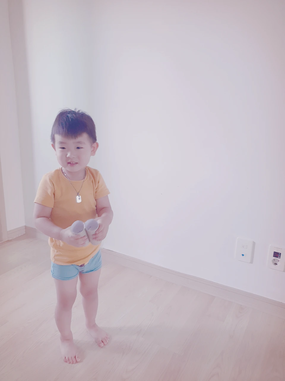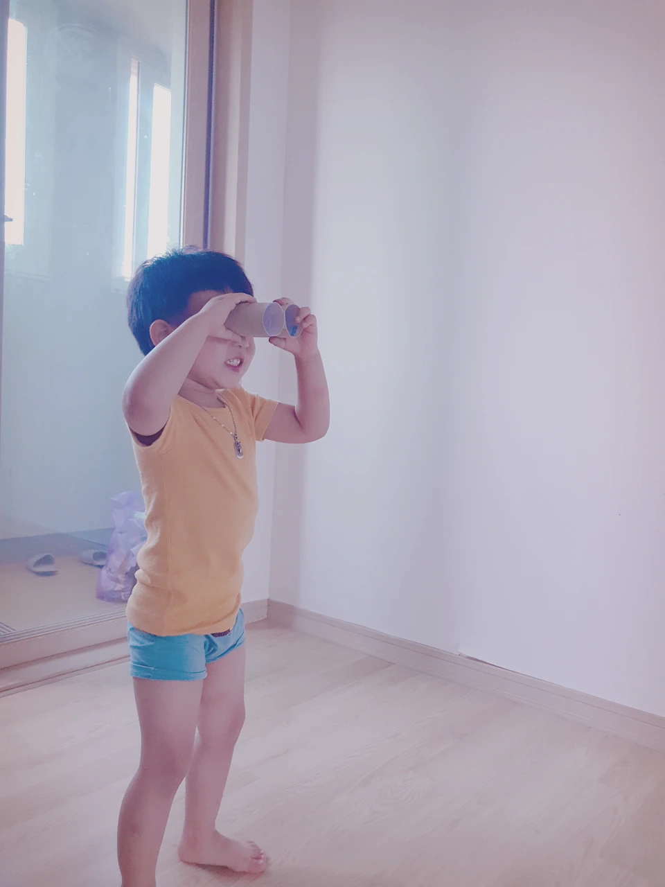 항상 다 쓴 화장지심을 모아두는 친정엄마 집에서 아이가 화장지심으로 잘 노는 모습을 보고 화장지심을 모으기 시작했다. 친정집에서는 모아 둔 화장지심이 많이 있어서 쌓기 놀이도 하고, 여러 개를 이어서 구슬도 넣어보고 미니카도 넣어보고 재미있게 놀았다. 집으로 돌아와 화장지심을 모으기 시작했는데 딱 2개를 모았을 때였다. 바다에서 파도가 오는 상황 놀이를 하는 중에 화장지심 두 개가 생각났다. 아이와 망원경을 만들어서 스티커도 붙이고, 상황 놀이도 하며 신나게 반나절을 놀고, 지금도 아이방에 소중히 올려져 있다.