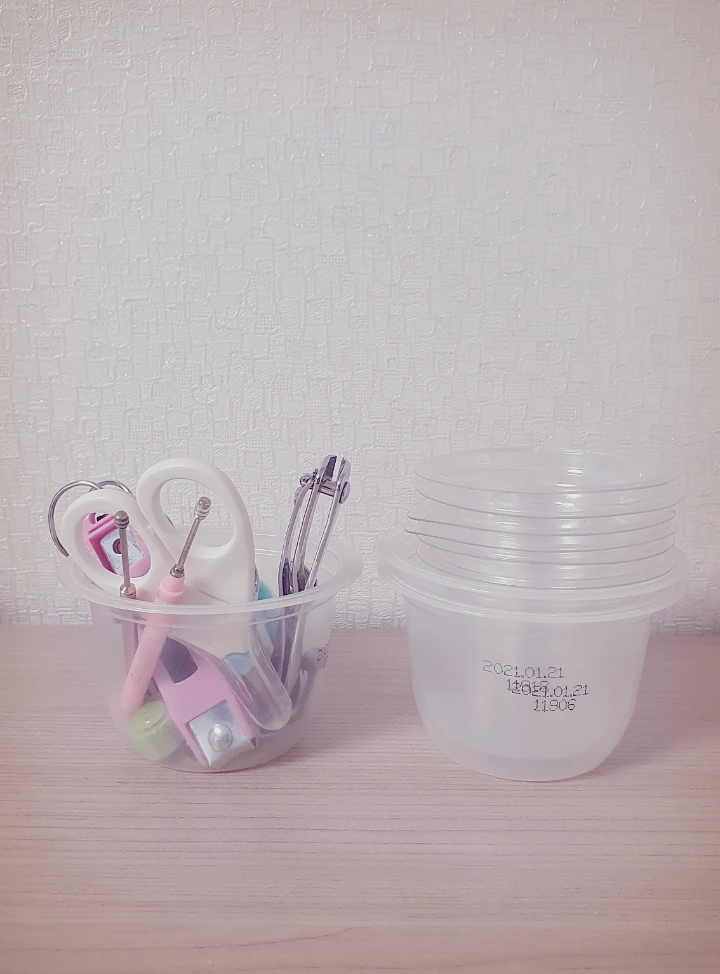 그래서 아이가 미술놀이를 할 때 물통으로 쓰려고 모아두었다. 하나 둘 모으던 게 10개가 넘었고, 물통의 용도뿐만이 아닌 잃어버리기 쉬운 작은 소지품들을 모아두기에도 딱이었다. 흩어져있던 신랑의 귀마개들을 넣어놓고, 서랍 장안의 작은 소지품들을 구분해서 넣어놓으니 찾기도 쉽고 꺼내기도 좋았다. 그리고 우연히 아이의 치실을 넣어두었는데, 위생적이기까지 해서 치실 통으로도 사용 중이다.