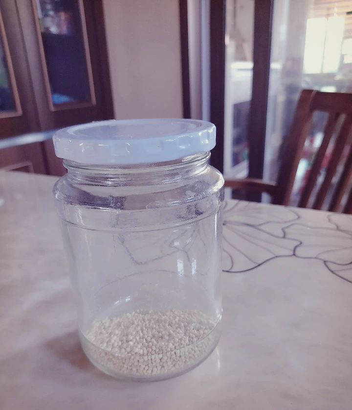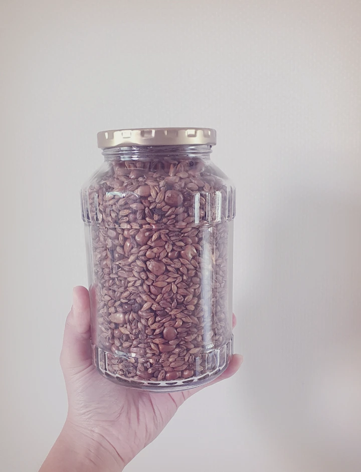 커피를 좋아하는 신랑의 커피콩들을 담아 놓는 통이 되기도 하고, 보리차를 좋아하는 아들의 볶은 보리를 담아두는 통으로도 쓴다. 그리고 내가 직접 만든 그래놀라를 만들어 담아놓기도 한다. 또, 부모님 집에서 얻어온 된장, 쌈장을 담아놓기도 하고, 설거지 브러시를 말려놓을 때 사용하기도 한다.만능 유리병이다.