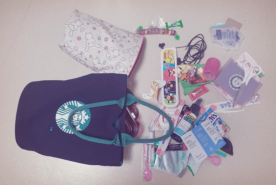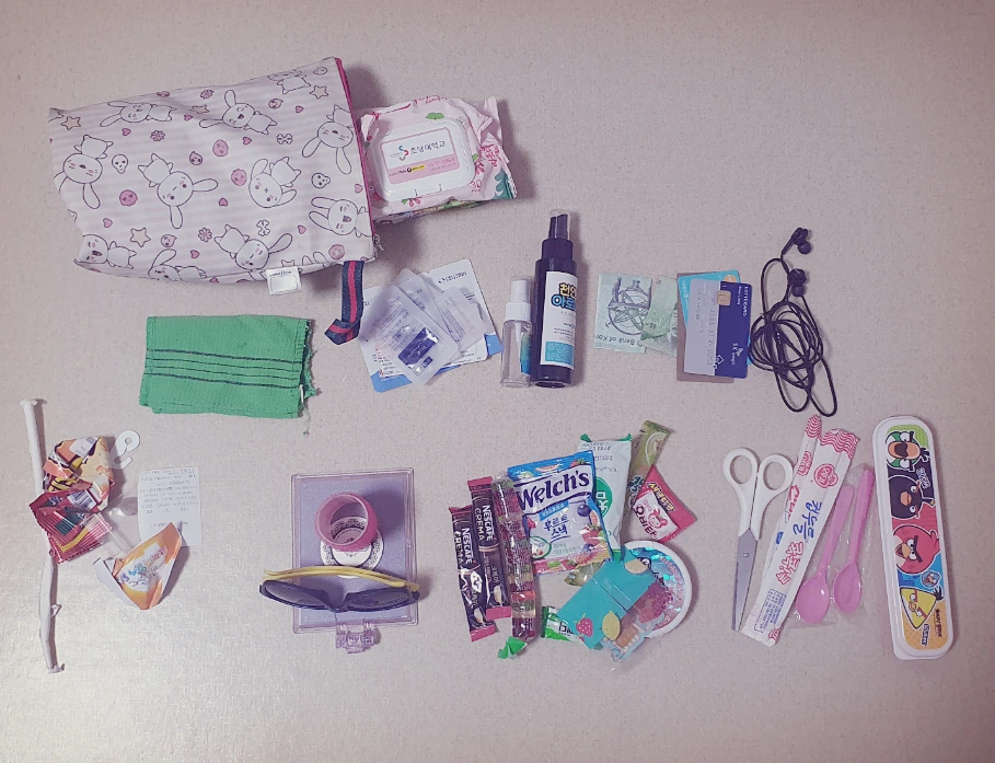 가방 속에는 그동안 모아 온(?) 손소독제들, 당이 떨어질 때 먹는 내 사탕들과 간식들, 앞머리 롤, 모기기피제, 가위, 이어폰, 대일밴드, 거울, 일회용 젓가락, 때밀이(?), 쓰레기들까지..