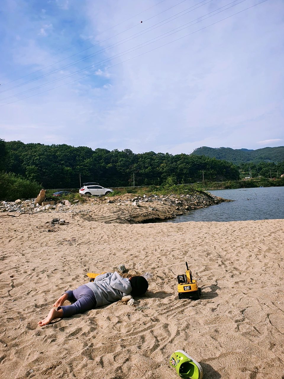 아이 역시 너무 좋아했다. 모래사장이 있다는 말에 덤프트럭과 포클레인을 챙겨 오더니 도착하자마자 신발을 벗고 모래와 한 몸이 되었다.