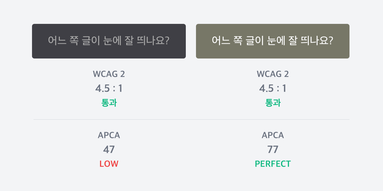 그러나 이러한 사람 눈의 ‘부정확한 인식’ 때문에 역설적으로 APCA가 필요한 것입니다. 그동안 WCAG2에서는 기계적인 계산으로만 명암대비 규칙을 정했기 때문에 눈과 뇌에서 인식하는 주변 환경에 따른 ‘착시’와 같은 요소를 고려하지 못한 것이지요.