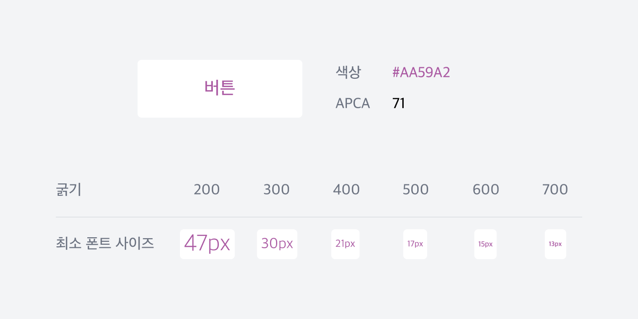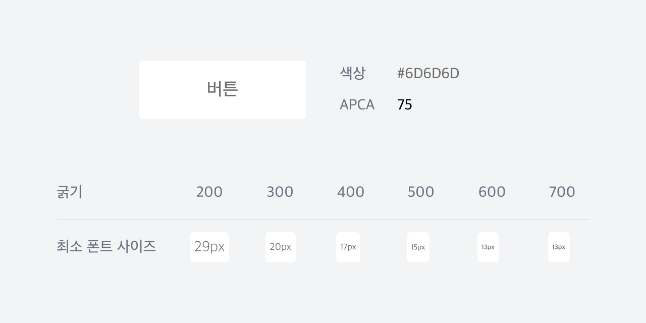 새로운 기준은 글꼴 크기와 굵기 모두를 고려합니다. 위에 기준점수는 글꼴 크기와 굵기에 따라 다르게 표현됩니다. 아래를 참조하면, #ffffff배경에 #6d6 d6d 텍스트 점수가 75점이라면, 글꼴 굵기에 따라 권고 최소 글꼴 크기가 다르게 나타납니다.