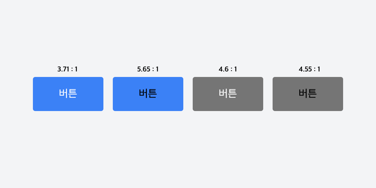 3:1, 4.5:1 두 가지 기준으로 명암대비를 규정하는 것은 사람 눈이 실제로 색을 인지하는 과정에 비해 너무도 단순하고, 현재 일반적으로 사용하는 LED/LCD 디스플레이 환경에 대응하지 못한다는 것이 그 이유입니다. 대표적으로 다음의 이미지를 살펴볼까요? 파란색 버튼 그룹의 경우 오른쪽이 명암대비에 부합하지만, 실제 눈으로 보았을 때는 왼쪽 버튼의 글씨가 더 눈에 잘 띄게 됩니다. 짙은 회색 버튼 그룹의 경우 왼쪽 버튼의 글씨가 확연히 눈에 띄지만 두 명암대비는 근소한 차이를 보입니다.