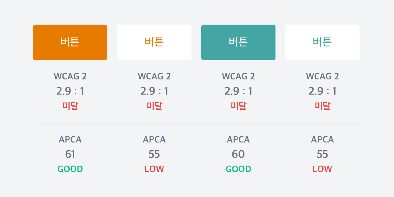 이런 발전은, 아래와 같이 WCAG2에서는 해결할 수 없었던 다양한 명암대비의 문제들을 해결합니다. 디자이너들 사이에서 말이 많았던 대표적인 주황색 배경에 흰색 텍스트 버튼 또한 APCA에서는 좋은 점수로 통과합니다.