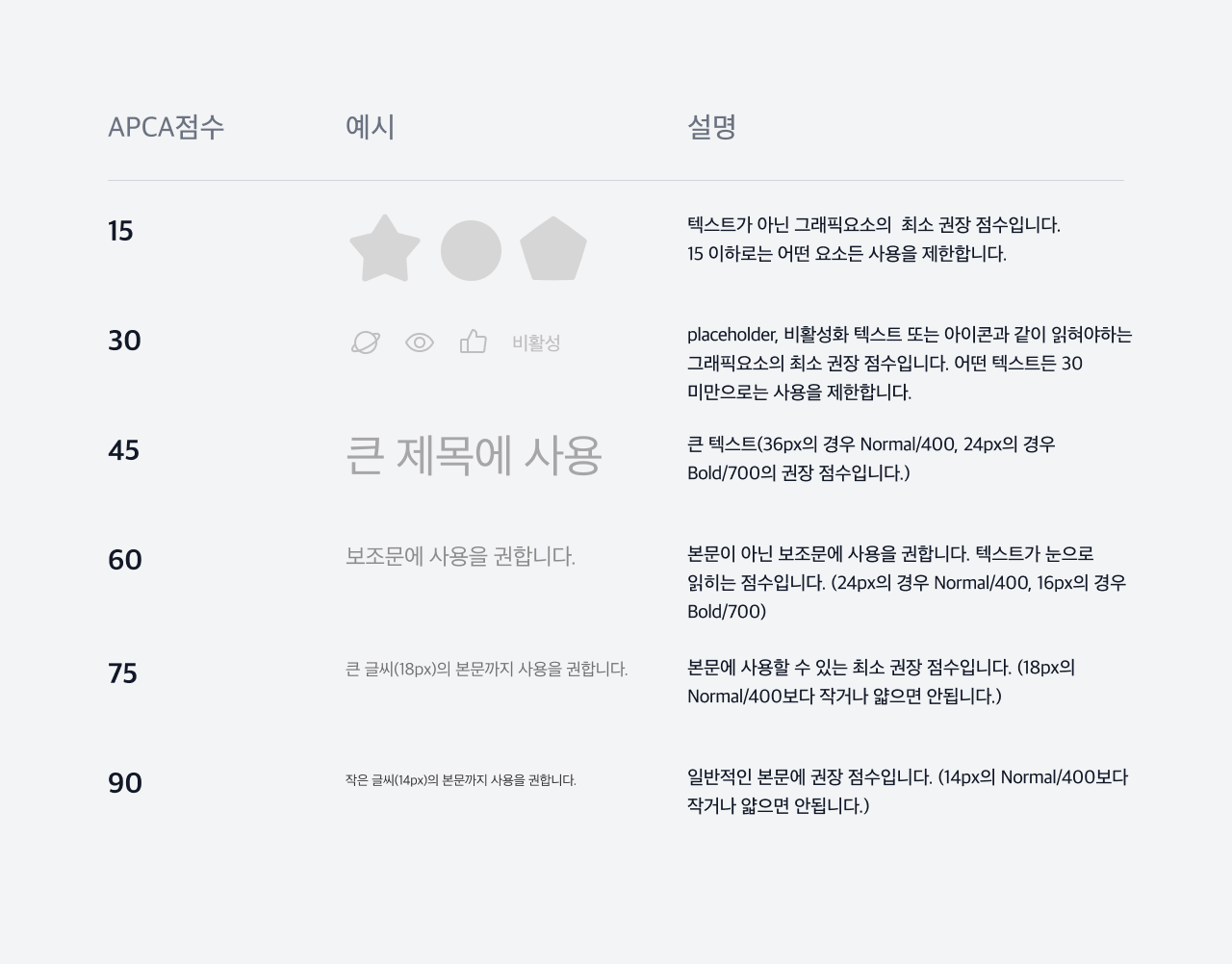 60점은 본문 텍스트(24px/Normal)가 아닌 곳의 최소 권고 명암대비입니다.