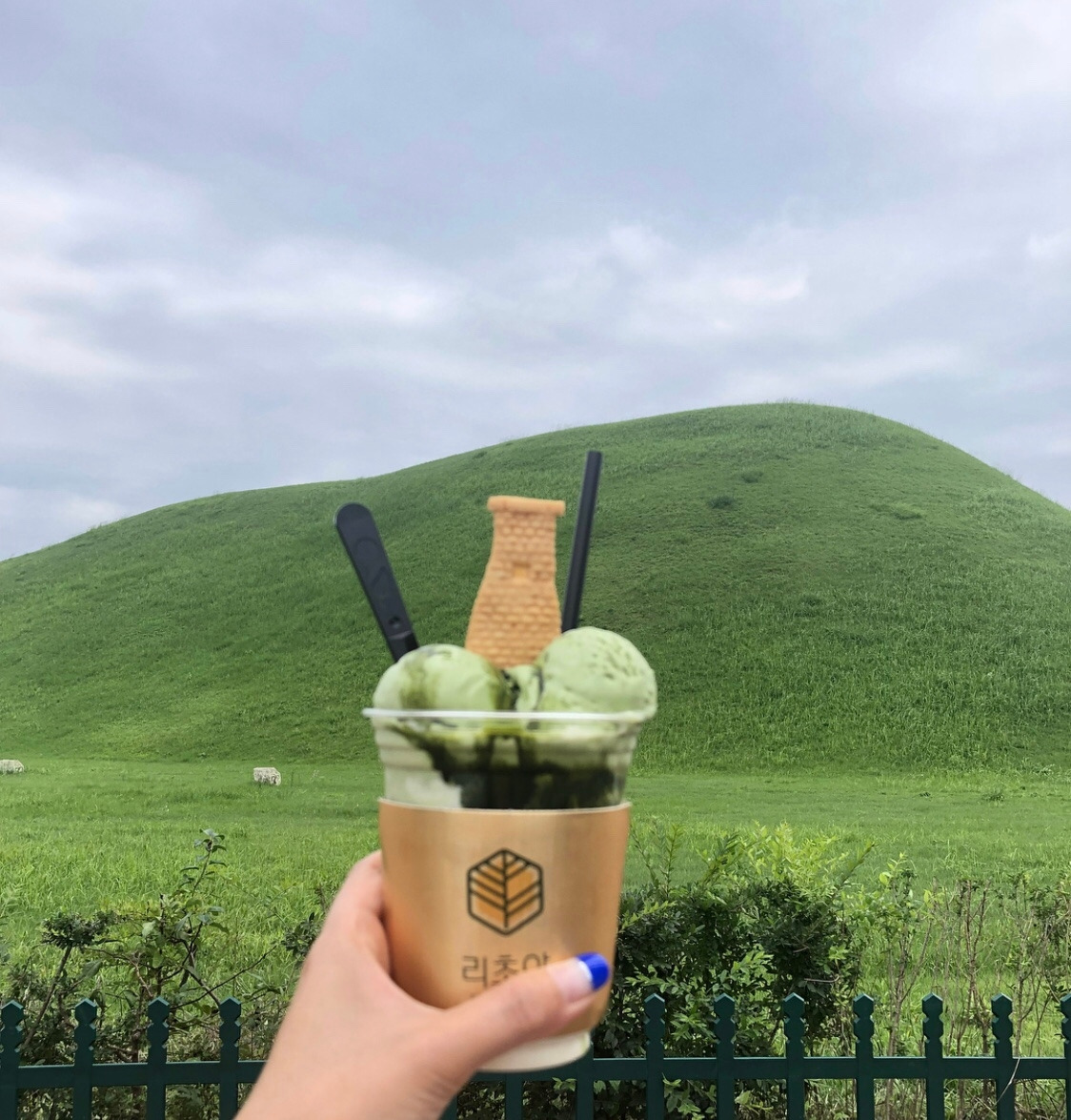 사람은 감감적인 동물이라 직접 먹고 만지며 느낀 것은 어쩌면 더 기억하기 쉽다. 그래서 훗날 첨성대가 어떤 곳이었지는지는 머릿 속으로 외우기는 어려워도 내가 그 당시에 먹은 첨성대 모양의 아이스크림만큼은 어떤 맛이었는지, '첨성대'하면 그 첨성대 모양의 아이스크림이 떠오르는 정도의 추억은 오래 기억에 머무를지 모른다. 첨성대 근처에 있는 조그만 가게, "리초야"에서는 "말차 먹은 첨성대"라는 음료를 시그니처로 팔고 있었다. 제주도에 가면 돌하르방 모양의 귤빵을 팔고, 진주에 가면 유등 모양의 빵을 파는 것과 같은 이치지만 그래도 첨성대 모양의 쿠키가 꽂혀있는 말차라떼의 모습은 귀여웠다. 이렇게 첨성대 모양의 음료를 마시며 첨성대가 어떤 곳인지 한번 더 보게 되는 것, 그것만으로도 경주에 온 이유는 충분했다.