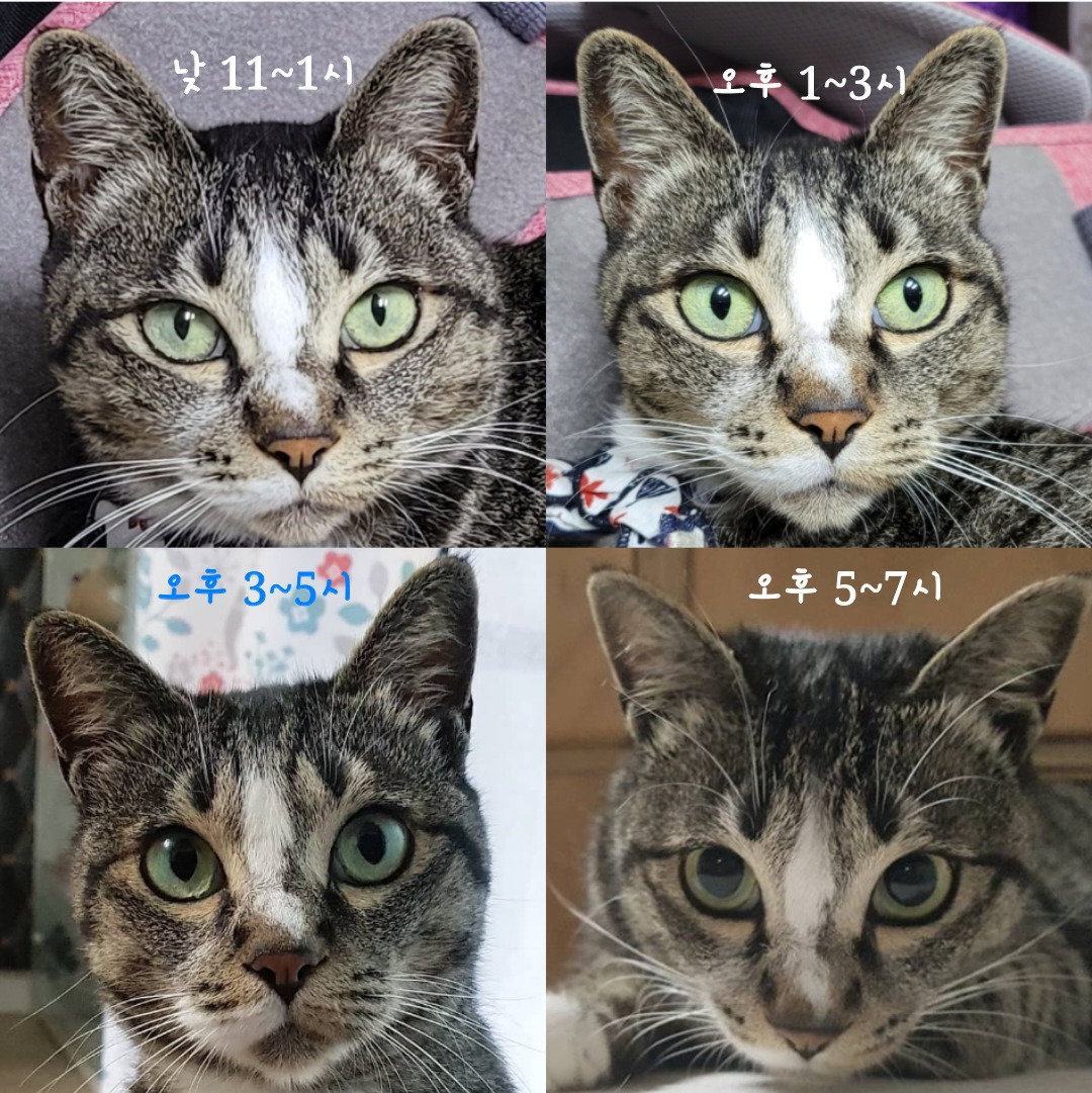 고양이의 동공의 크기를 보면 낮인지 밤인지를 알 수있을 뿐만 아니라 기분도 파악할 수있는데 동공이 확장이되면<공포,호기심,스트레스>의 상태, 동공이 수축되면 <화남,불안>을 의미함고양이의 동공은 밝기와 기분에 따라서 확장되기도 하고 수축되기도 하지만 시간이 지나면서 다시 원상태로 돌아오는 패턴을 유지해야 되는데,