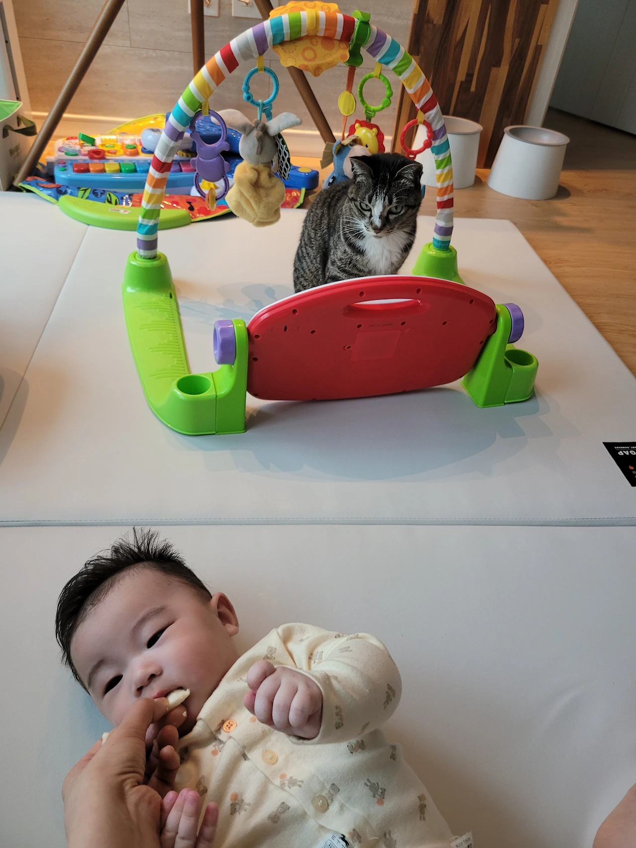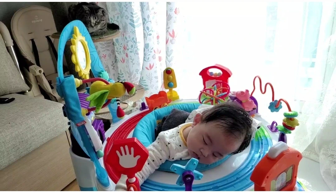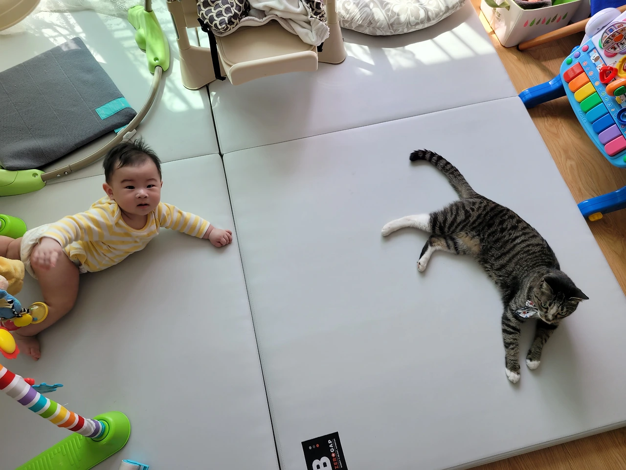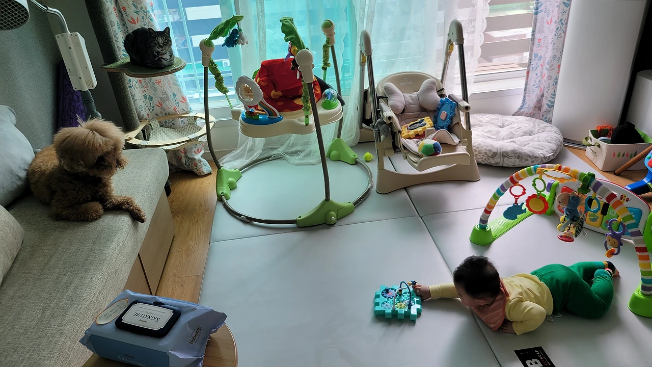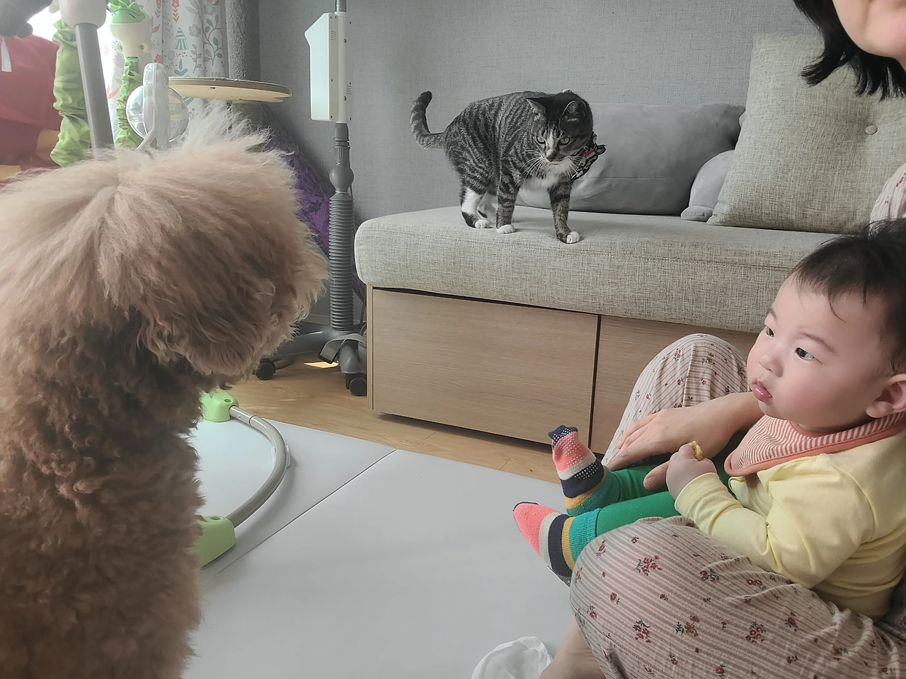 봄비는 처음 우리와 가족으로 만났던 그때처럼 봄비의 속도대로 아기에게 천천히 다가가고 있었고 아기한테 관심이 없었던 게 아니라 나에게도 그랬듯이 쉽게 다가가지 못했을 뿐 적당한 거리에서 늘 아기를 지켜보고 있었다.