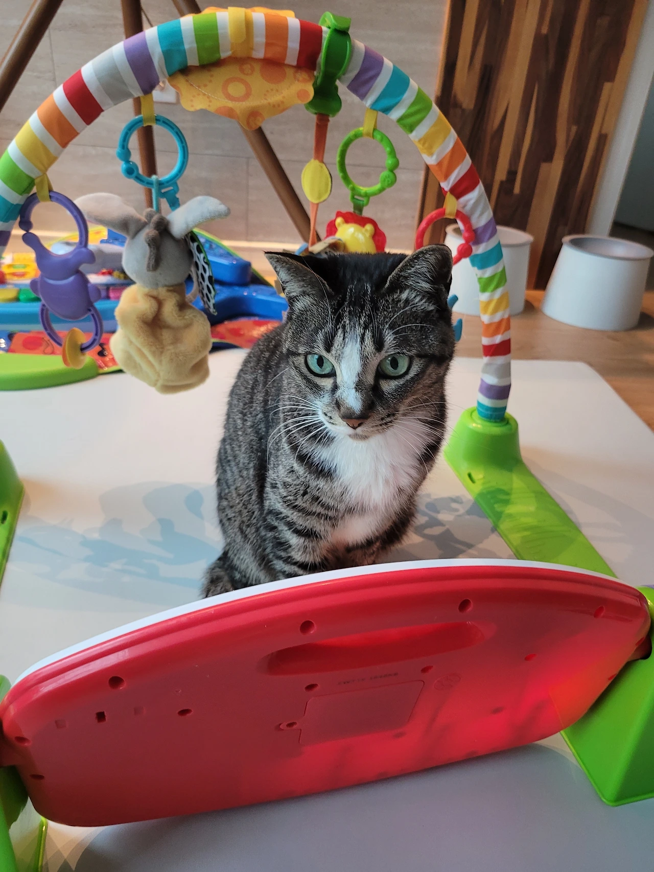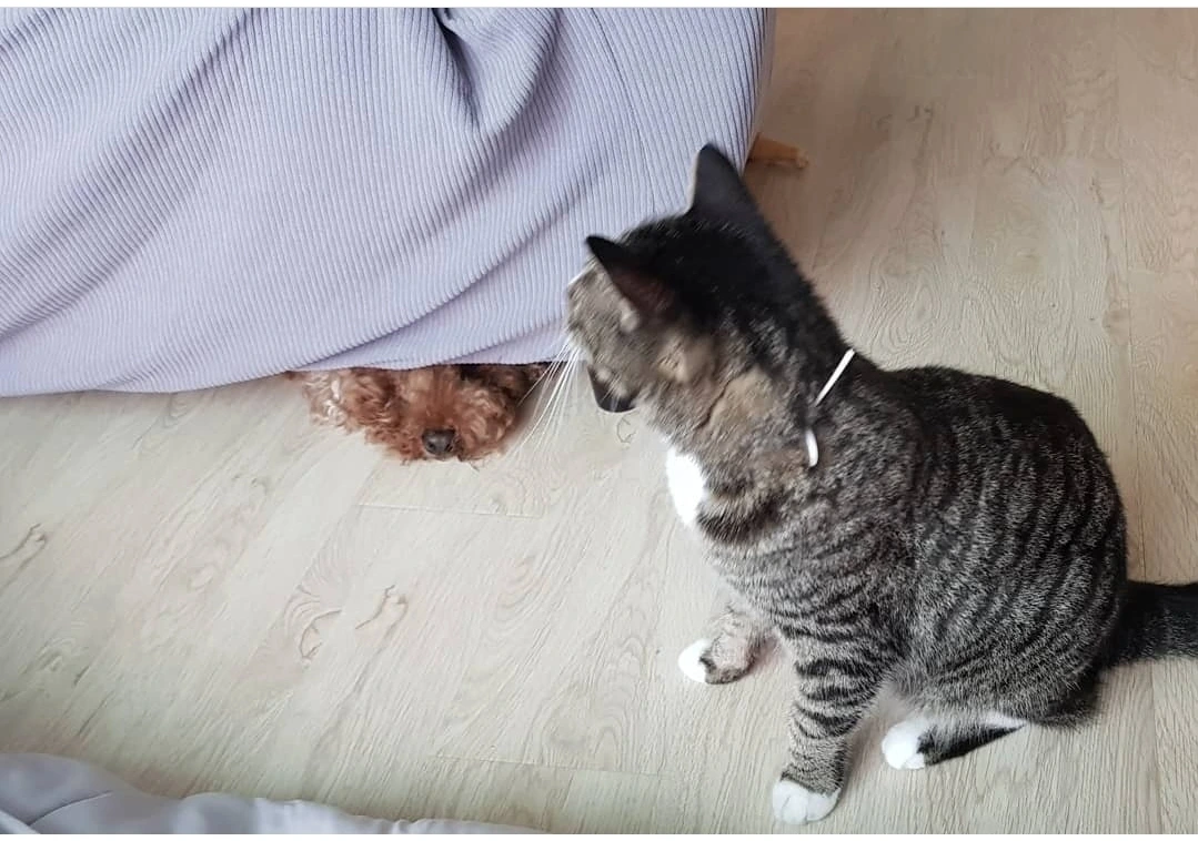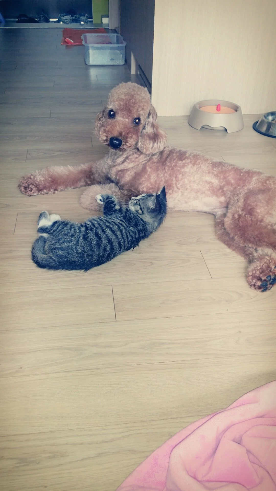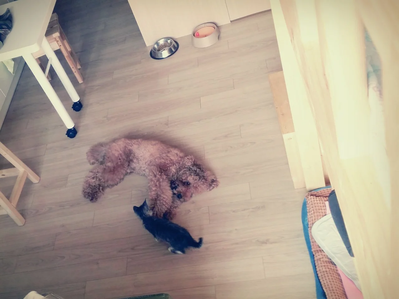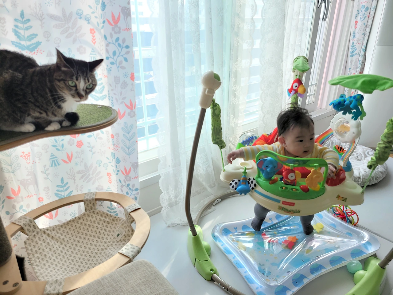 봄비는 처음 우리와 가족으로 만났던 그때처럼 봄비의 속도대로 아기에게 천천히 다가가고 있었고 아기한테 관심이 없었던 게 아니라 나에게도 그랬듯이 쉽게 다가가지 못했을 뿐 적당한 거리에서 늘 아기를 지켜보고 있었다.