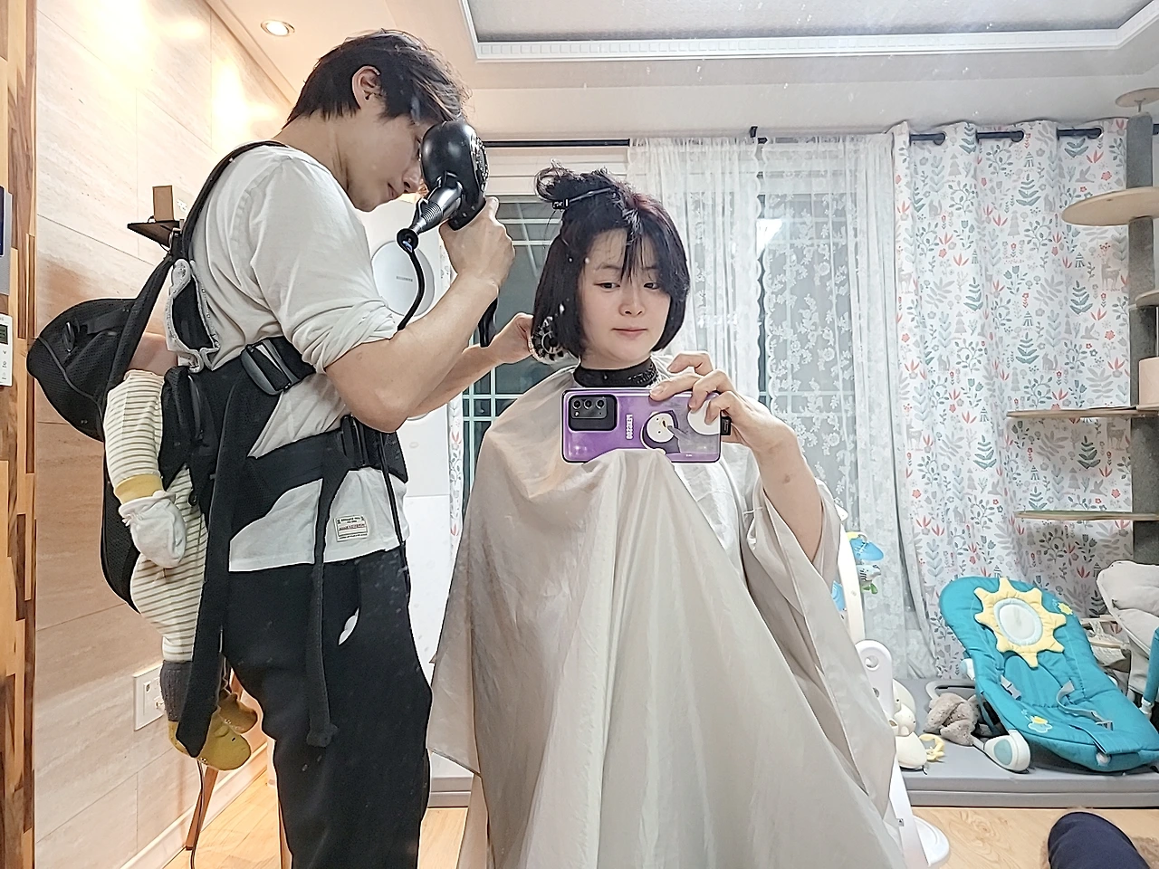 미용실 갈 시간이 없어서 헤어디자이너 남편님이 아기업고 머리해 주는 기술 습득