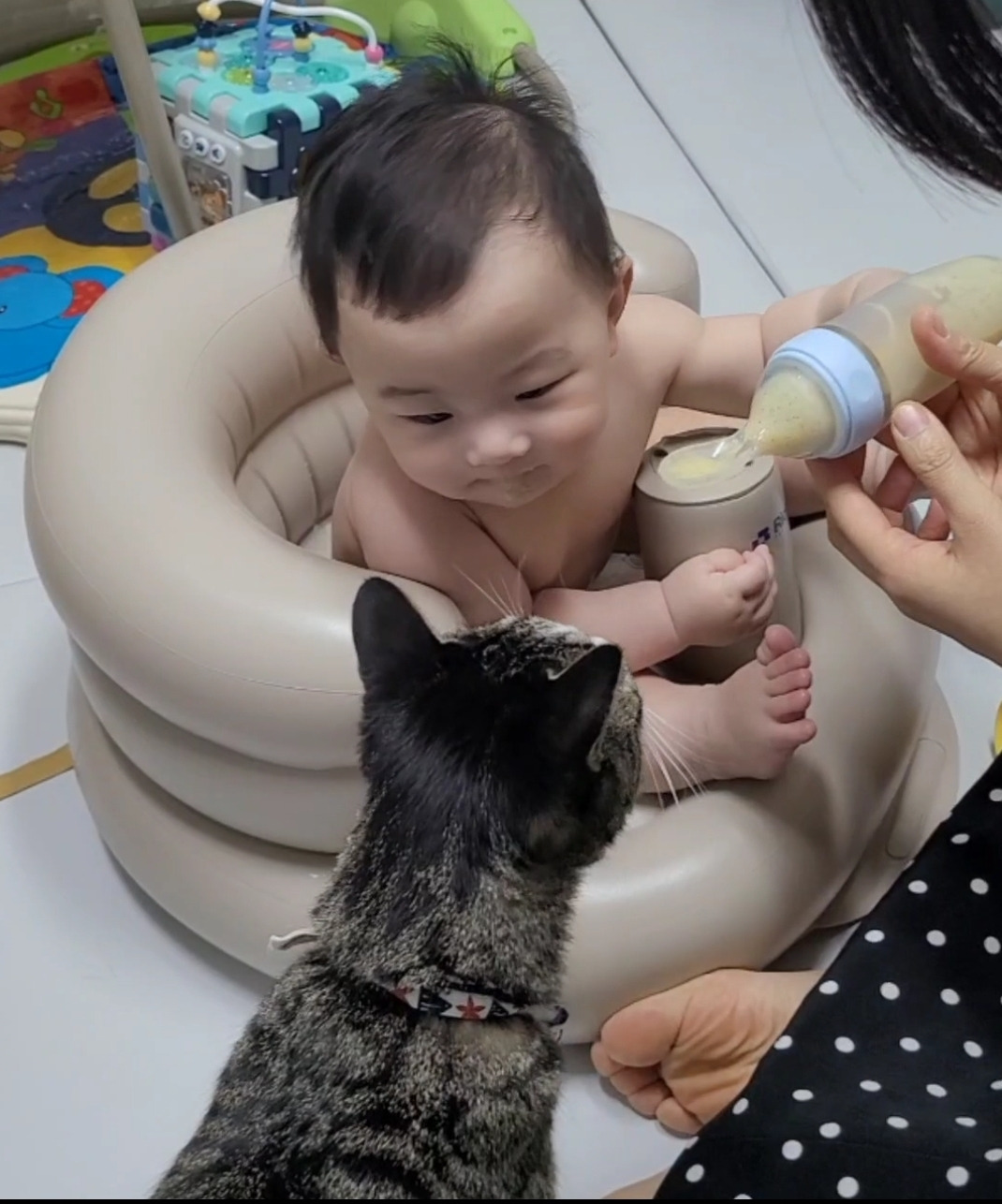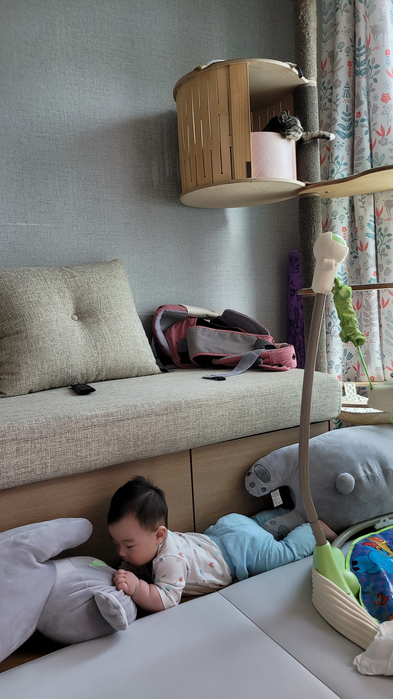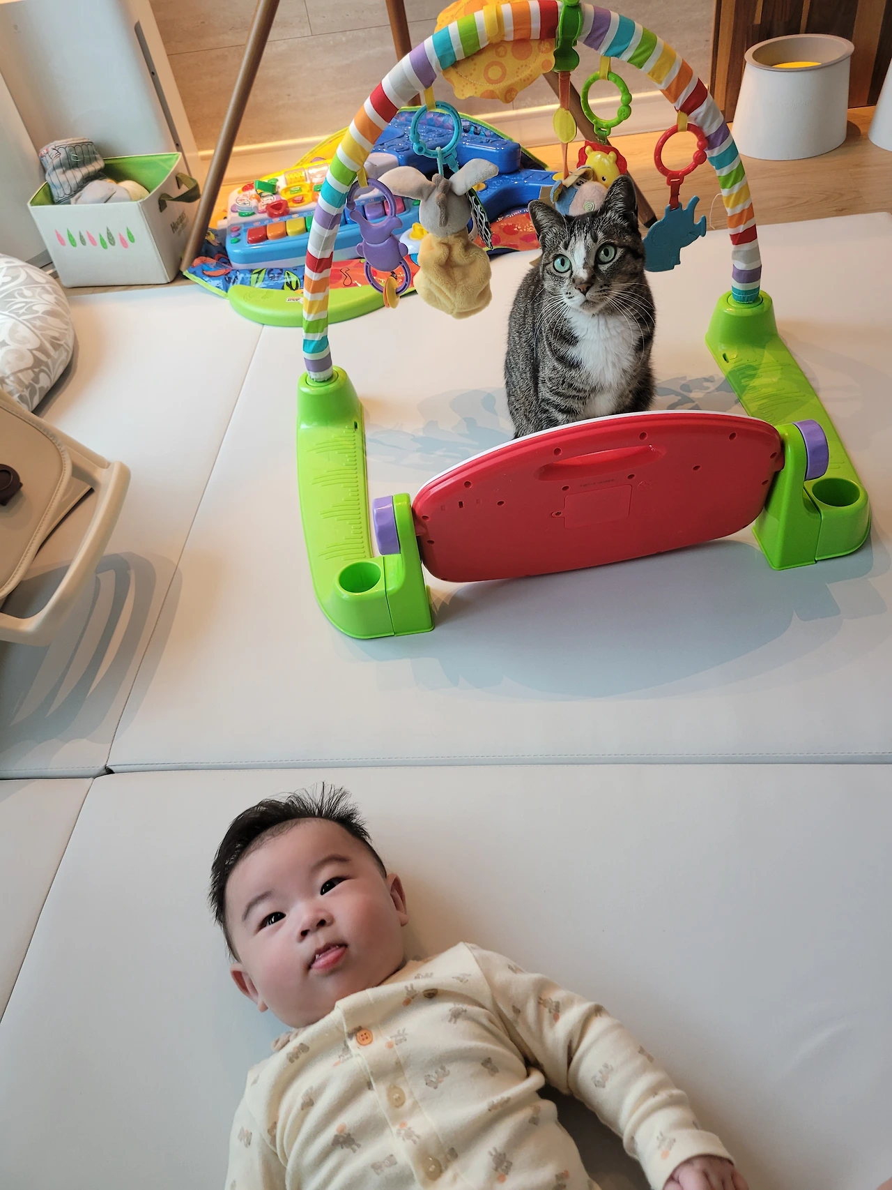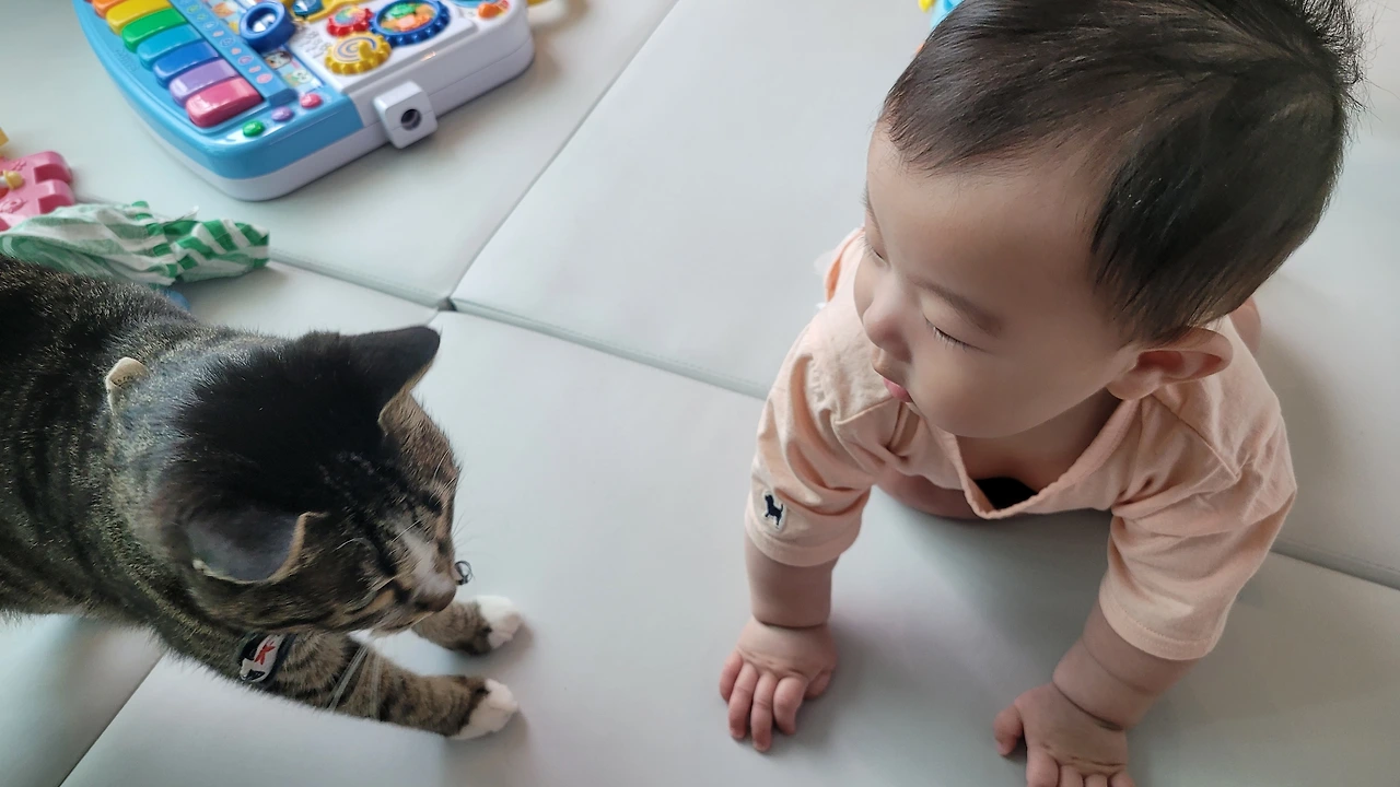 아기만 보이면 캣타워 안으로 숨거나 2층으로 피신을 다녔던 봄비도 이젠 아기 곁으로 점점 다가오고 있었다.