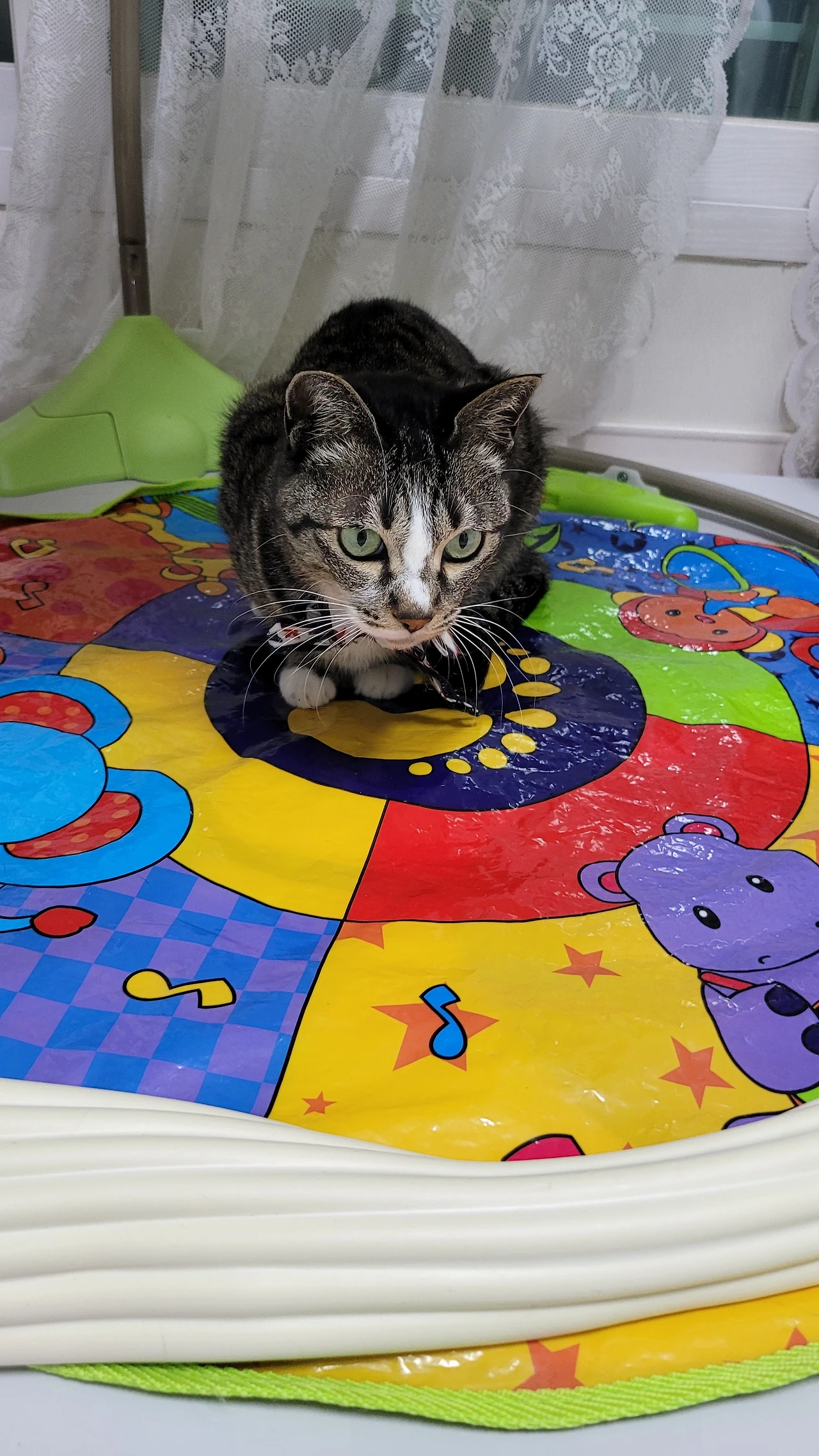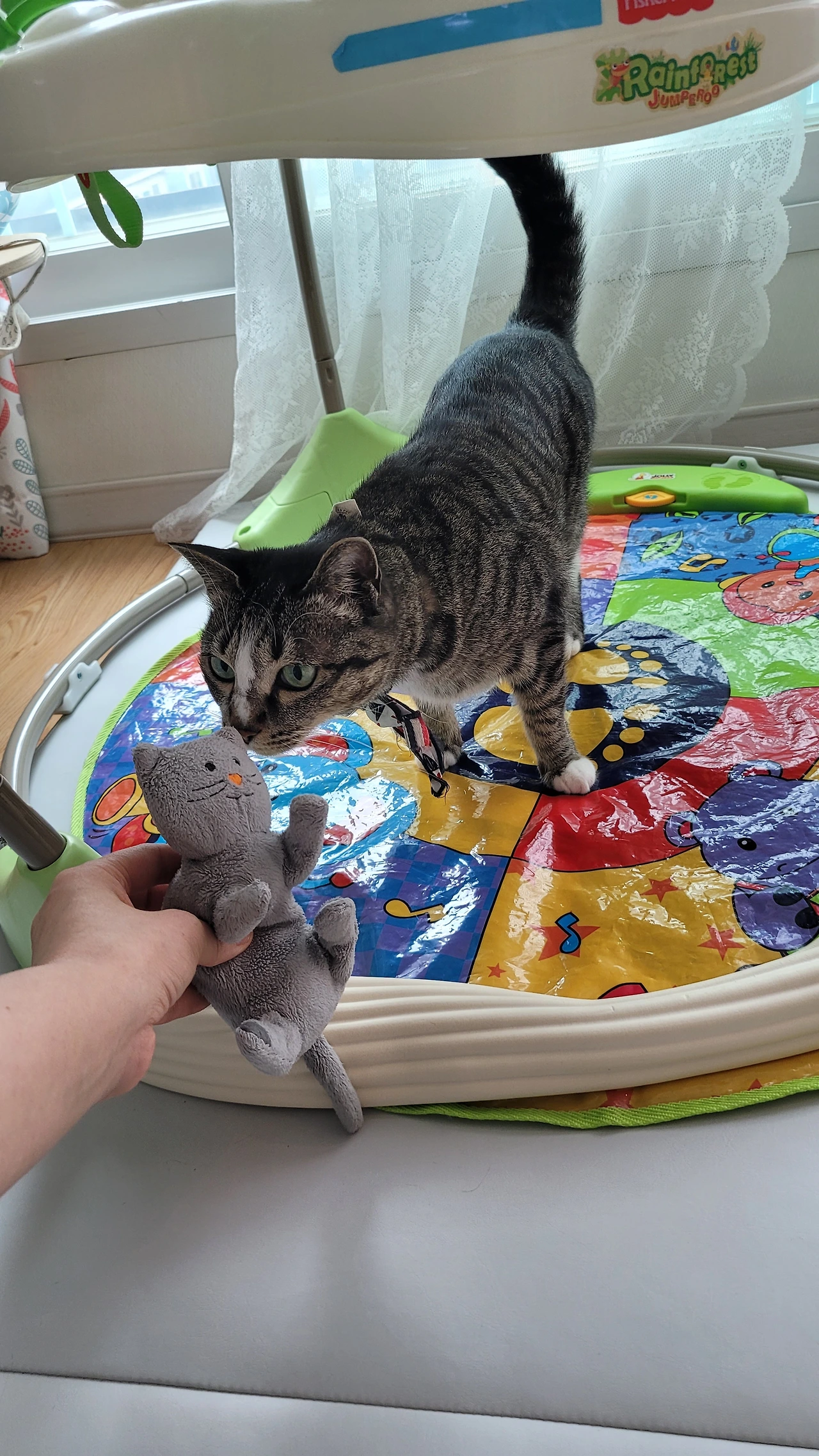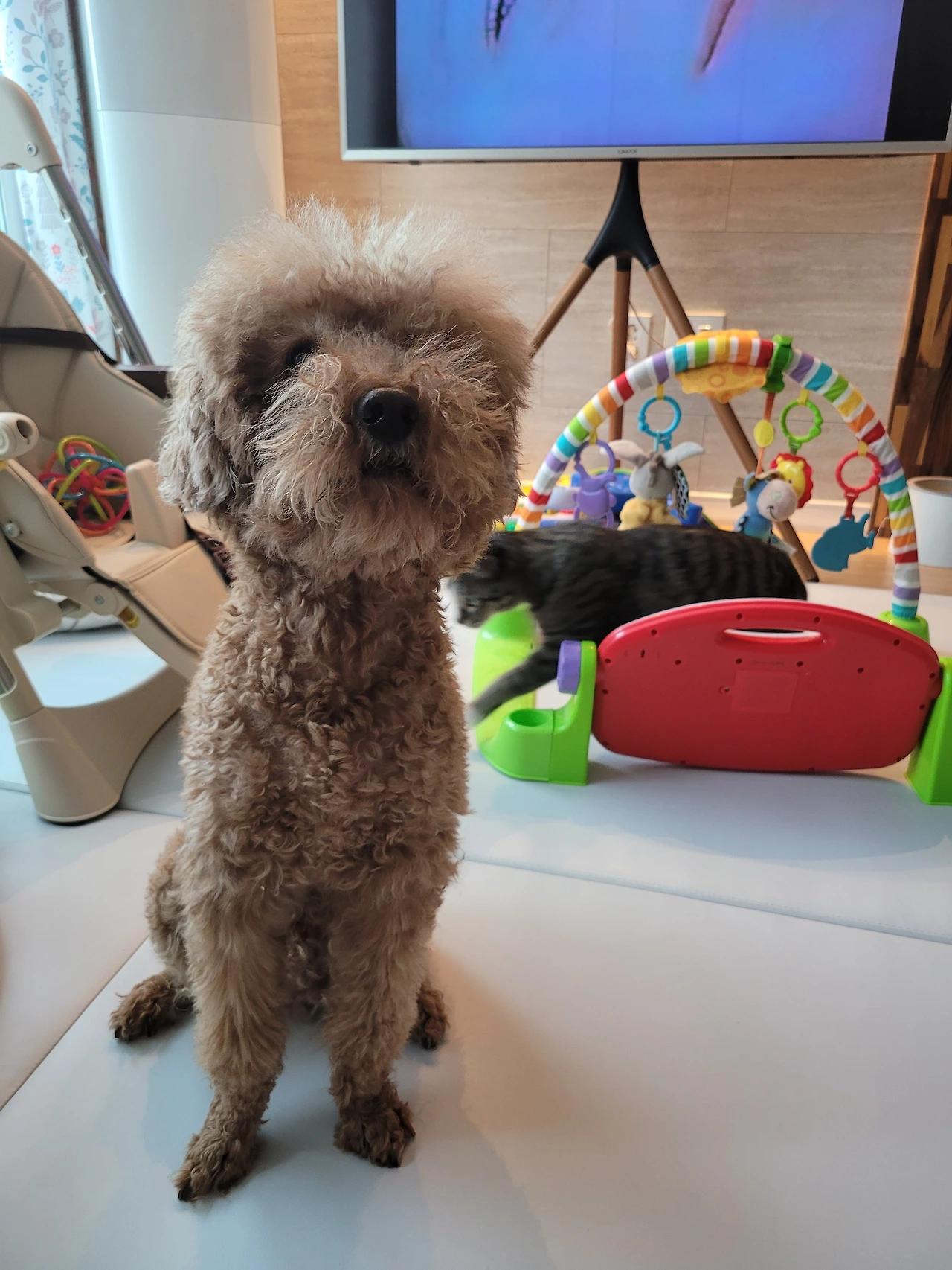 아기만 보이면 캣타워 안으로 숨거나 2층으로 피신을 다녔던 봄비도 이젠 아기 곁으로 점점 다가오고 있었다.