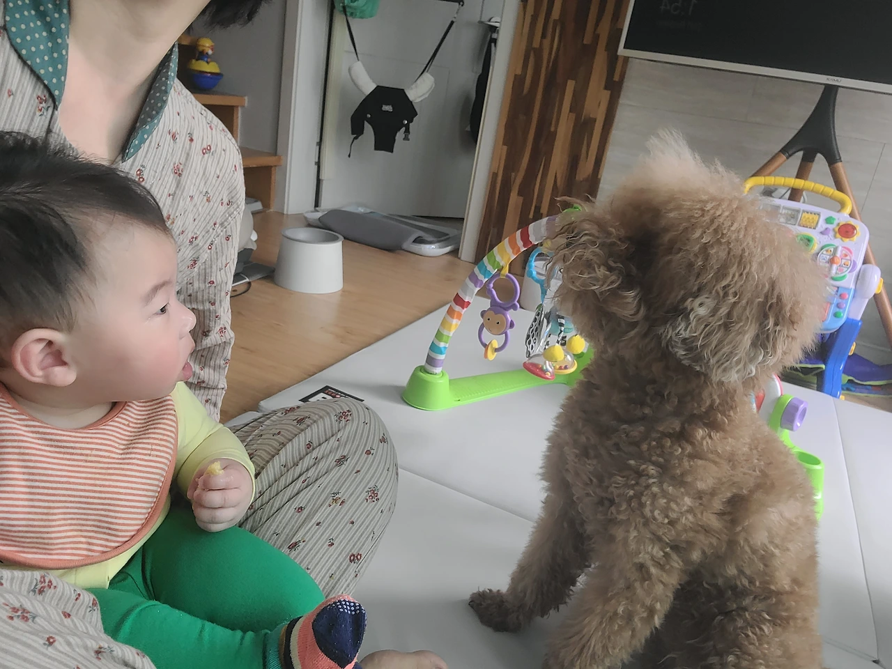 아기도 이제는 단비와 봄비가 시야에 들어오는지 꼬리를 흔들며 지나가는 모습만 봐도 까르르 웃으며 댕댕이와 야옹이를 관찰하기에 바쁘다.